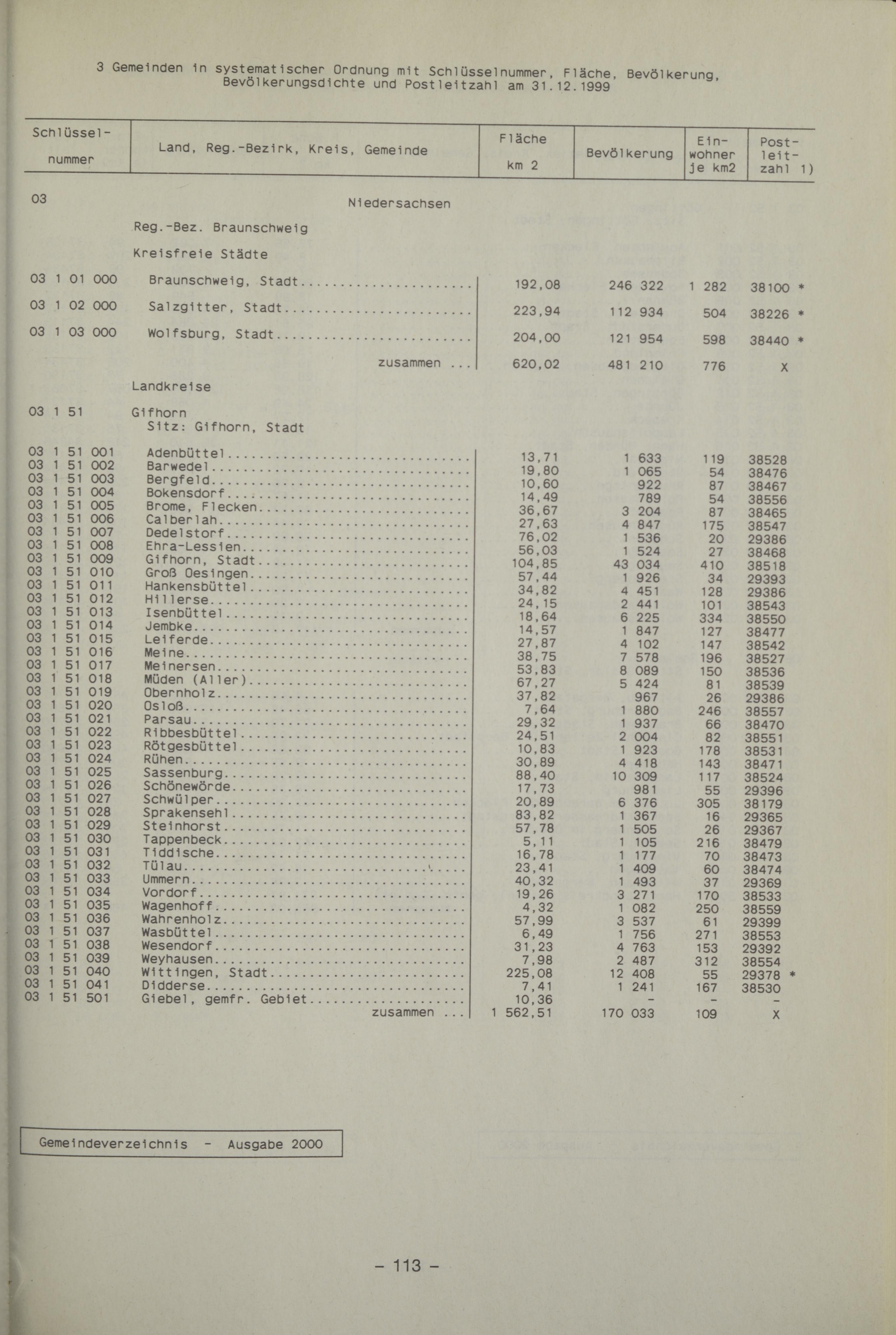 - 3 Gemeinden in systematischer Ordnung mit Schlüsselnummer, Fläche, Bevölkerung, Bevölkerungsdichte und Postleitzahl am 31.12.1999