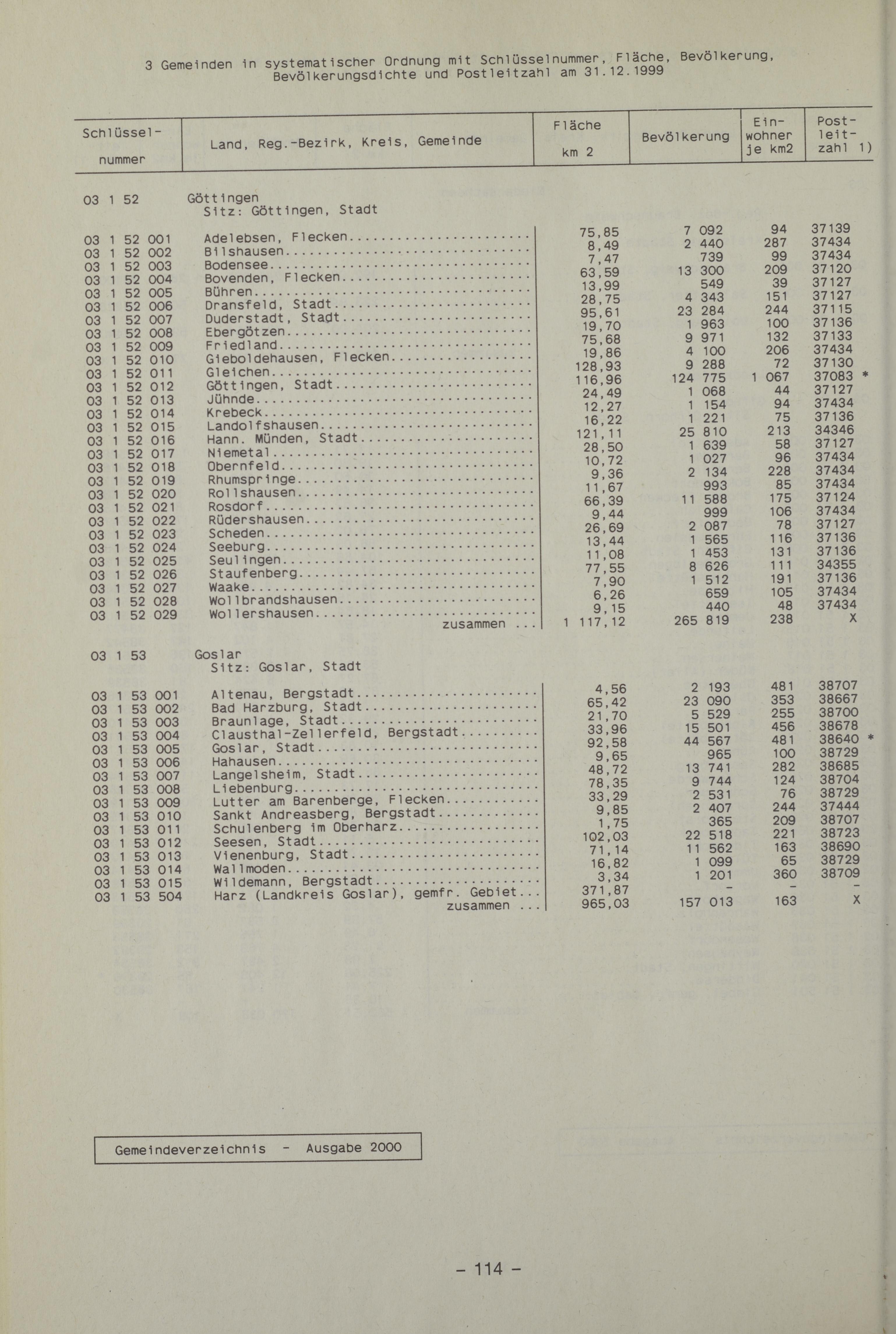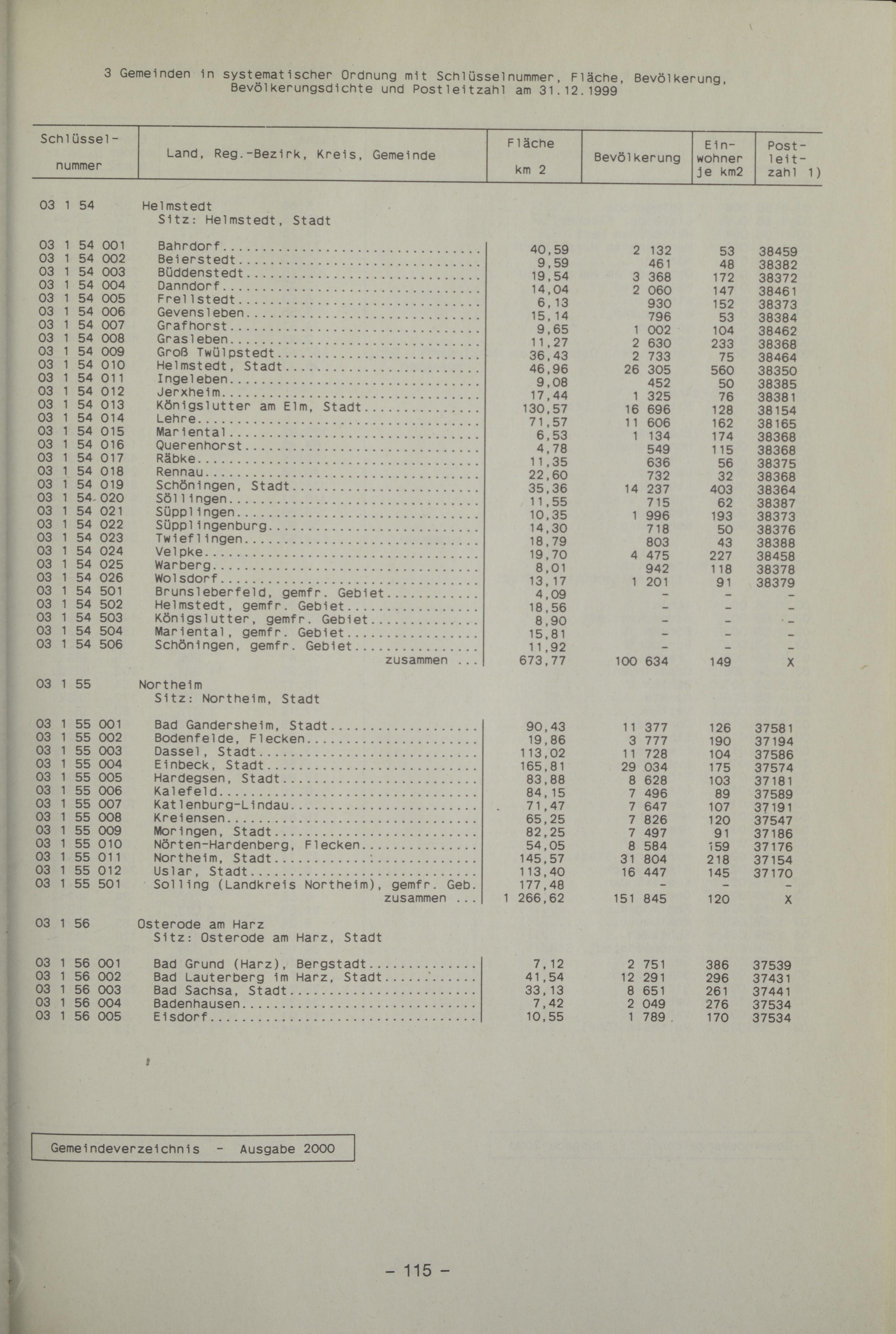 - 3 Gemeinden in systematischer Ordnung mit Schlüsselnummer, Fläche, Bevölkerung, Bevölkerungsdichte und Postleitzahl am 31.12.1999