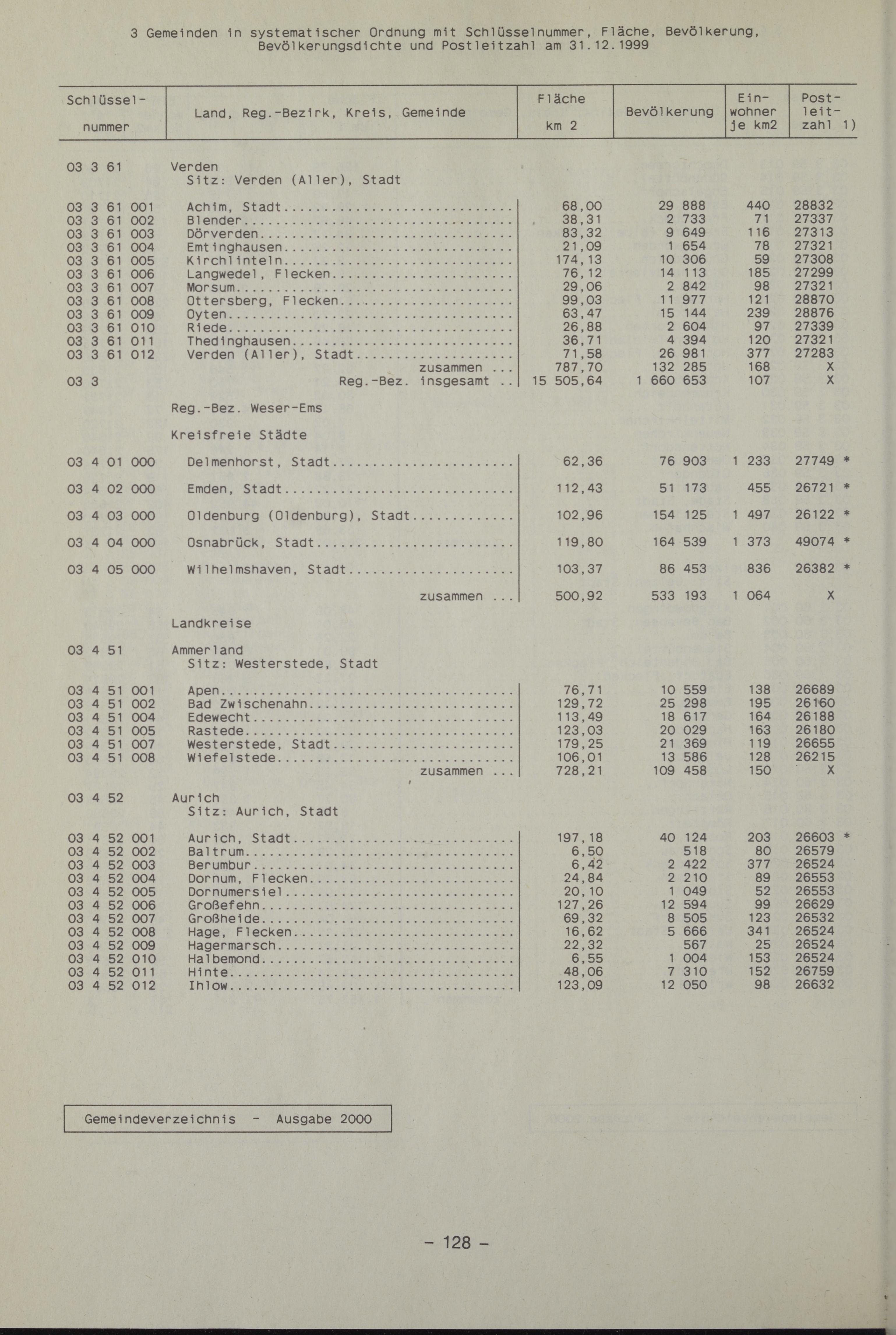 - 3 Gemeinden in systematischer Ordnung mit Schlüsselnummer, Fläche, Bevölkerung, Bevölkerungsdichte und Postleitzahl am 31.12.1999