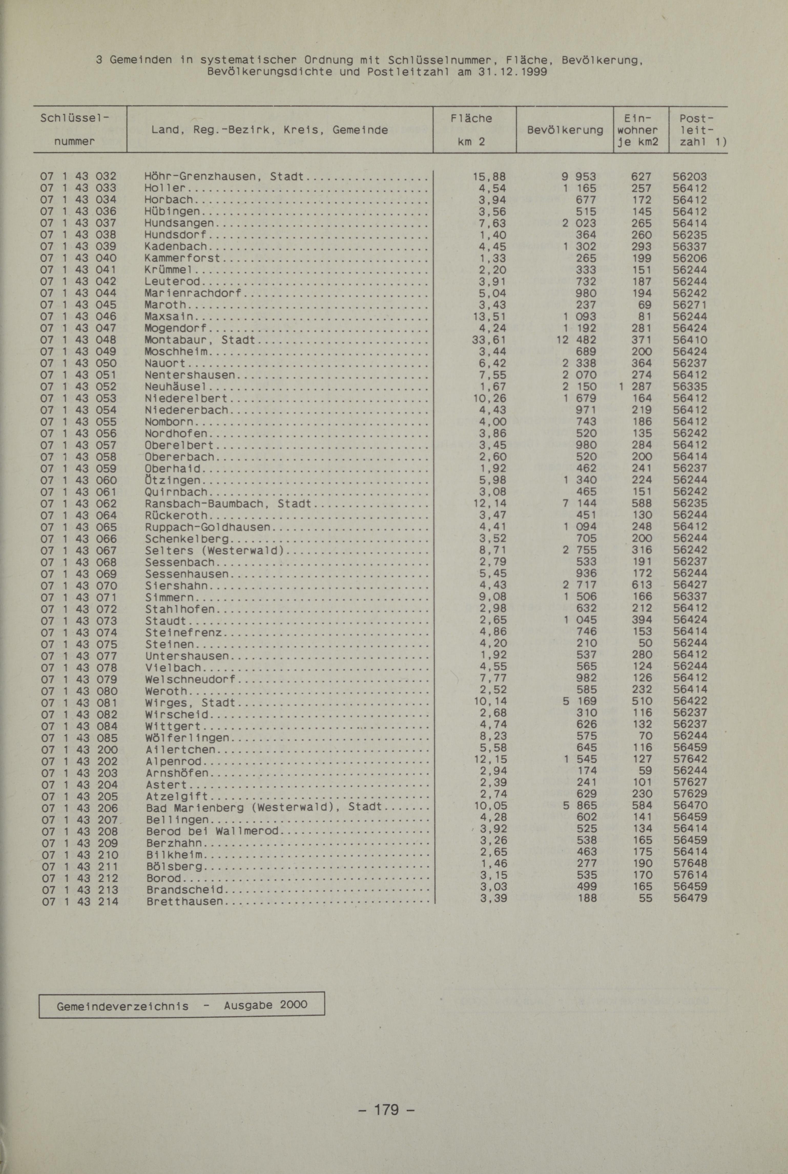 - 3 Gemeinden in systematischer Ordnung mit Schlüsselnummer, Fläche, Bevölkerung, Bevölkerungsdichte und Postleitzahl am 31.12.1999