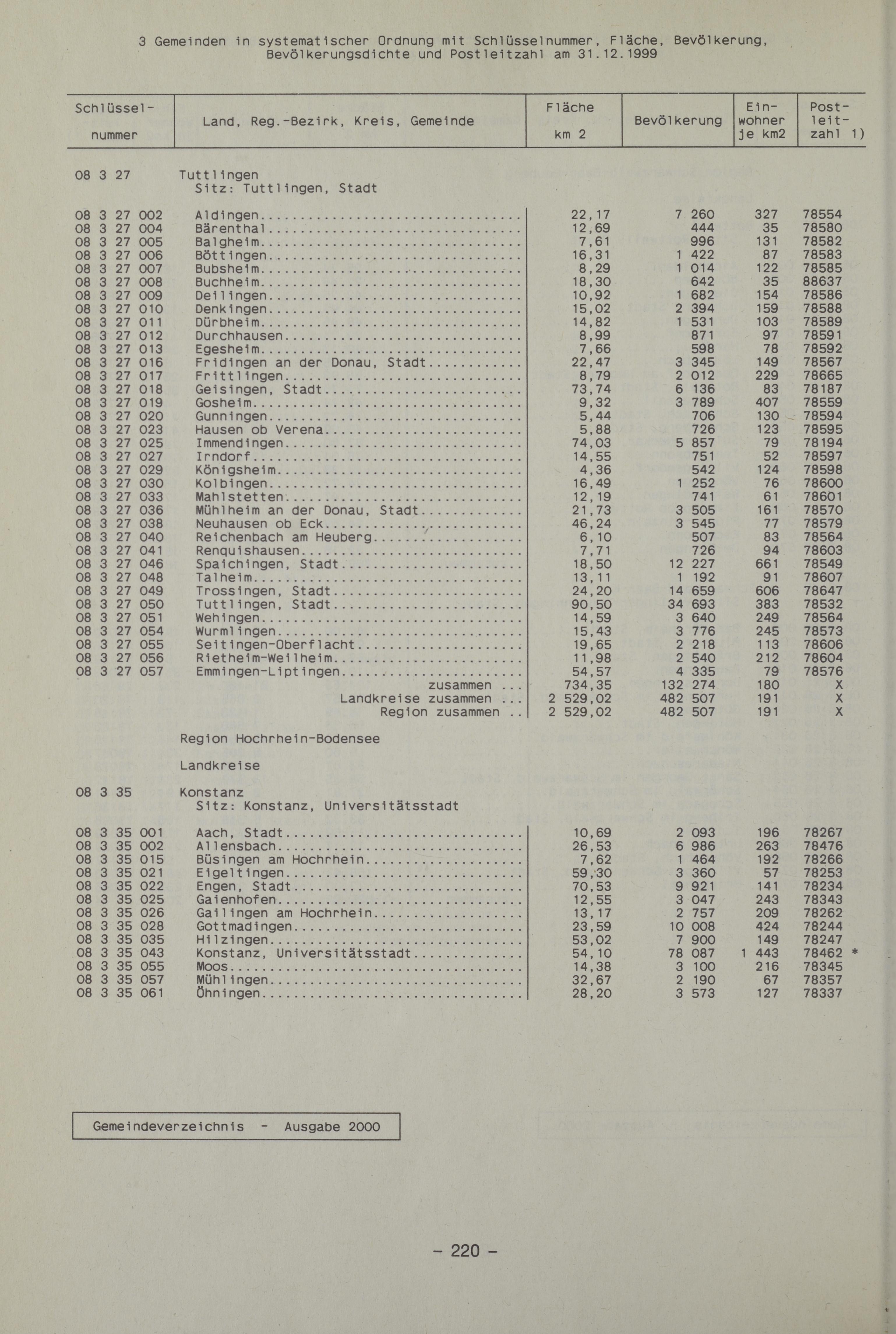 - 3 Gemeinden in systematischer Ordnung mit Schlüsselnummer, Fläche, Bevölkerung, Bevölkerungsdichte und Postleitzahl am 31.12.1999