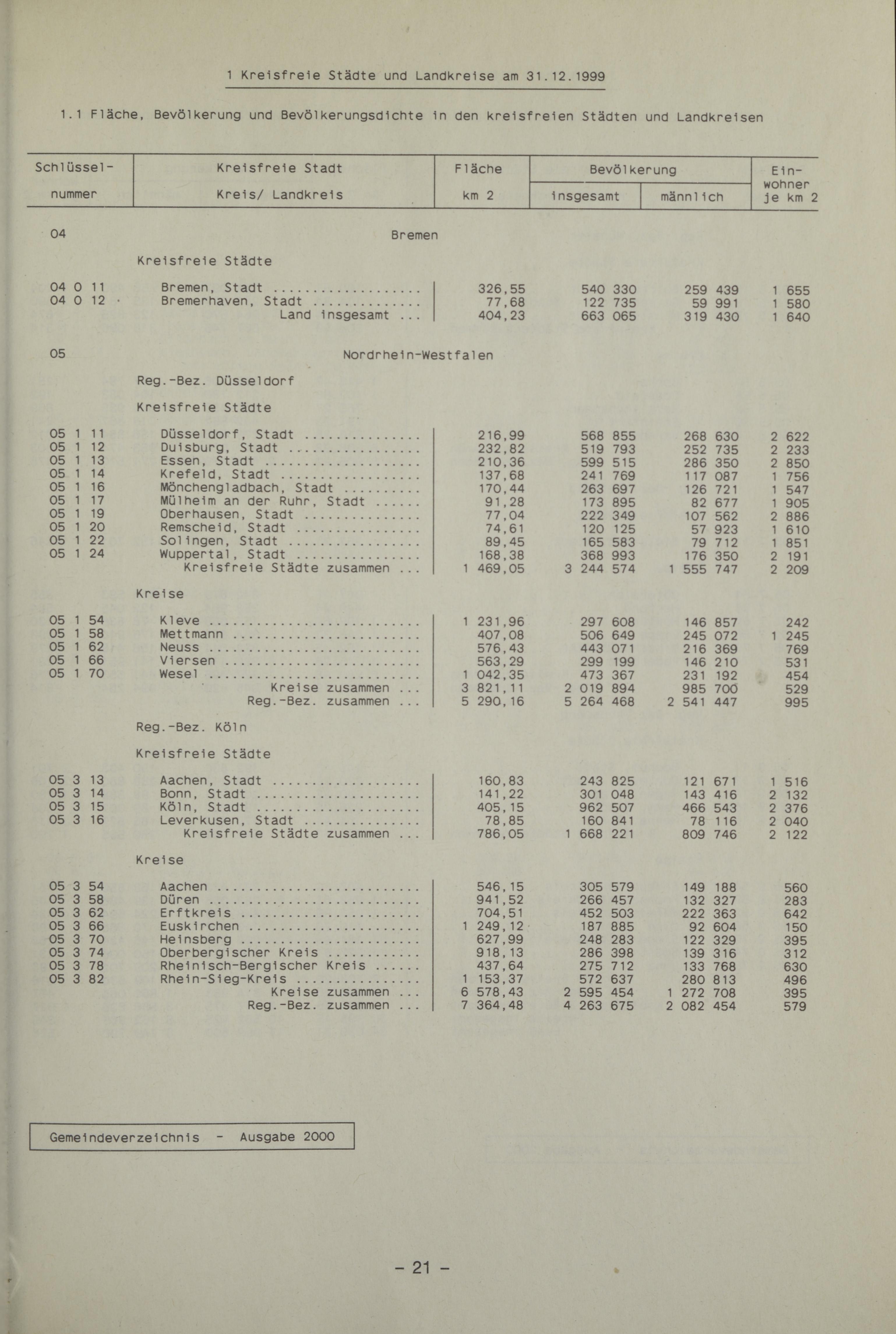 - [Abschnitt] 1 Kreisfreie Städte und Landkreise am 31.12.1999 19