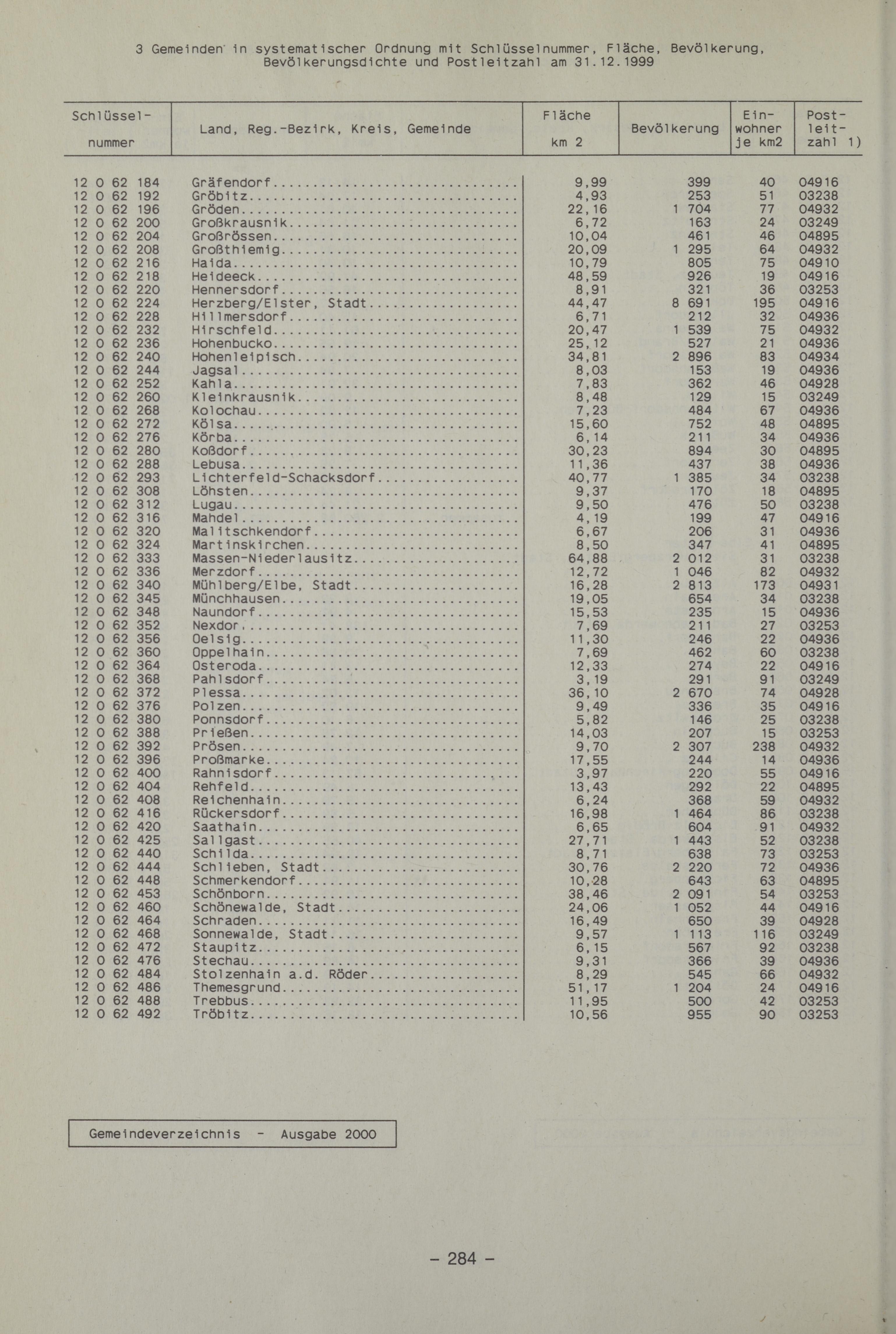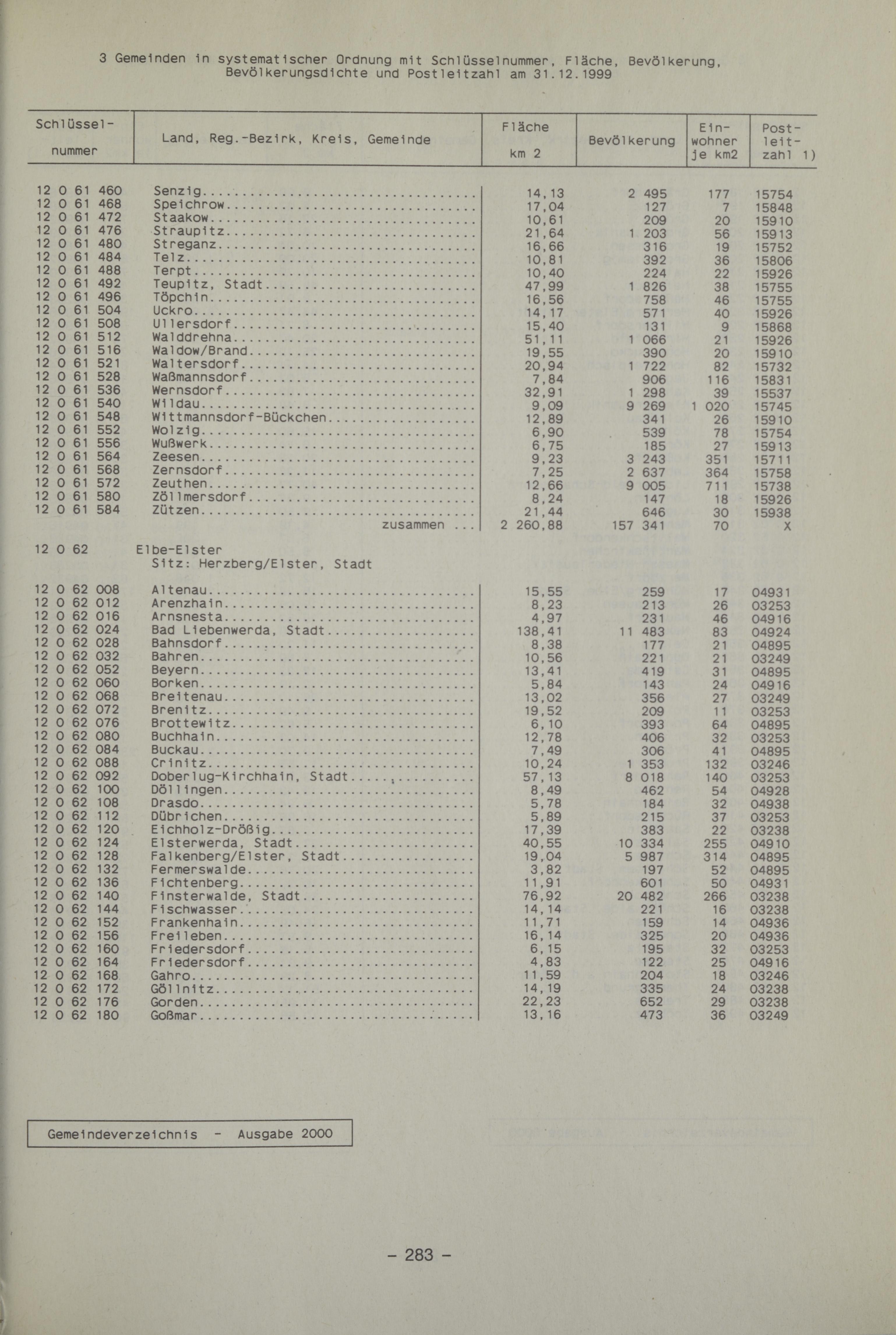 2000InhaltZeichenerklärung / AbkürzungenVorbemerkungEinführungEntwicklung der Zahl der kreisfreien Städte, Landkreise und GemeindenSchematische Übersicht über Aufbau und Inhalt der GemeindeschlüsselnummernVerwaltungsgliederung des Bundesgebietes am 31.12.1999Bevölkerungsdichte in den Kreisen der Bundesrepublik Deutschlands am 31.12.1999Karten der Bundesrepublik Deutschlands mit Ländern-, Regierungsbezirks- und Kreisgrenzen nach dem 31.12.19991 Kreisfreie Städte und Landkreise am 31.12.19991.1 Fläche, Bevölkerung und Bevölkerungsdichte in den kreisfreien Städten und Landkreisen1.2 Regierungsbezirke, kreisfreie Städte und Landkreise in alphabetischer Ordnung2 Gemeinden, Fläche und Bevölkerung in den Gemeindeverbänden am 31.12.19993 Gemeinden in systematischer Ordnung mit Schlüsselnummer, Fläche, Bevölkerung, Bevölkerungsdichte und Postleitzahl am 31.12.199901 Schleswig-Holstein und 02 Hamburg03 Niedersachsen und 04 Bremen05 Nordrhein-Westfalen06 Hessen07 Rheinland-Pfalz08 Baden-Württemberg09 Bayern10 Saarland11 Berlin und 12 Brandenburg13 Mecklenburg-Vorpommern14 Sachsen15 Sachsen-Anhalt16 Thüringen4 Gemeinden in alphabetischer Ordnung mit Schlüsselnummer, Bevölkerung und Postleitzahl am 31.12.19995 Gemeinden mit 5000 Einwohnern und mehr nach Einwohnergrößenklassen mit ihrer Postleitzahl, Fläche, Bevölkerung und Bevölkerungsdichte am 31.12.19996 Kreisfreie Städte, Landkreise und Gemeinden nach Größenklassen6.1 Gemeinden von 1950 bis 1999 nach Einwohnergrößenklassen6.2 Kreisfreie Städte und Landkreise in den Ländern am 31.12.19996.3 Gemeinden in den Ländern am 31.12.1999 nach Einwohnerklassen6.4 Gemeinden in den Ländern am 31.12.1999 nach Flächengrößenklassen6.5 Gemeinden in den Ländern am 31.12.1999 nach der Bevölkerungsdichte7 Die kleinste und größten Gemeinden und Kreise nach der Fläche, Bevölkerung und Bevölkerungsdichte am 31.12.19997.1 Die 10 kleinsten Gemeinden7.2 Die 10 größten Gemeinden7.3 Die 20 kleinsten Kreise7.4 Die 20 größten Kreise8 Städte am 31.12.19998.1 Fläche, Bevölkerung und Bevölkerungsdichte nach Einwohnergrößenklassen8.2 Nach Ländern und Einwohnergrößenklassen