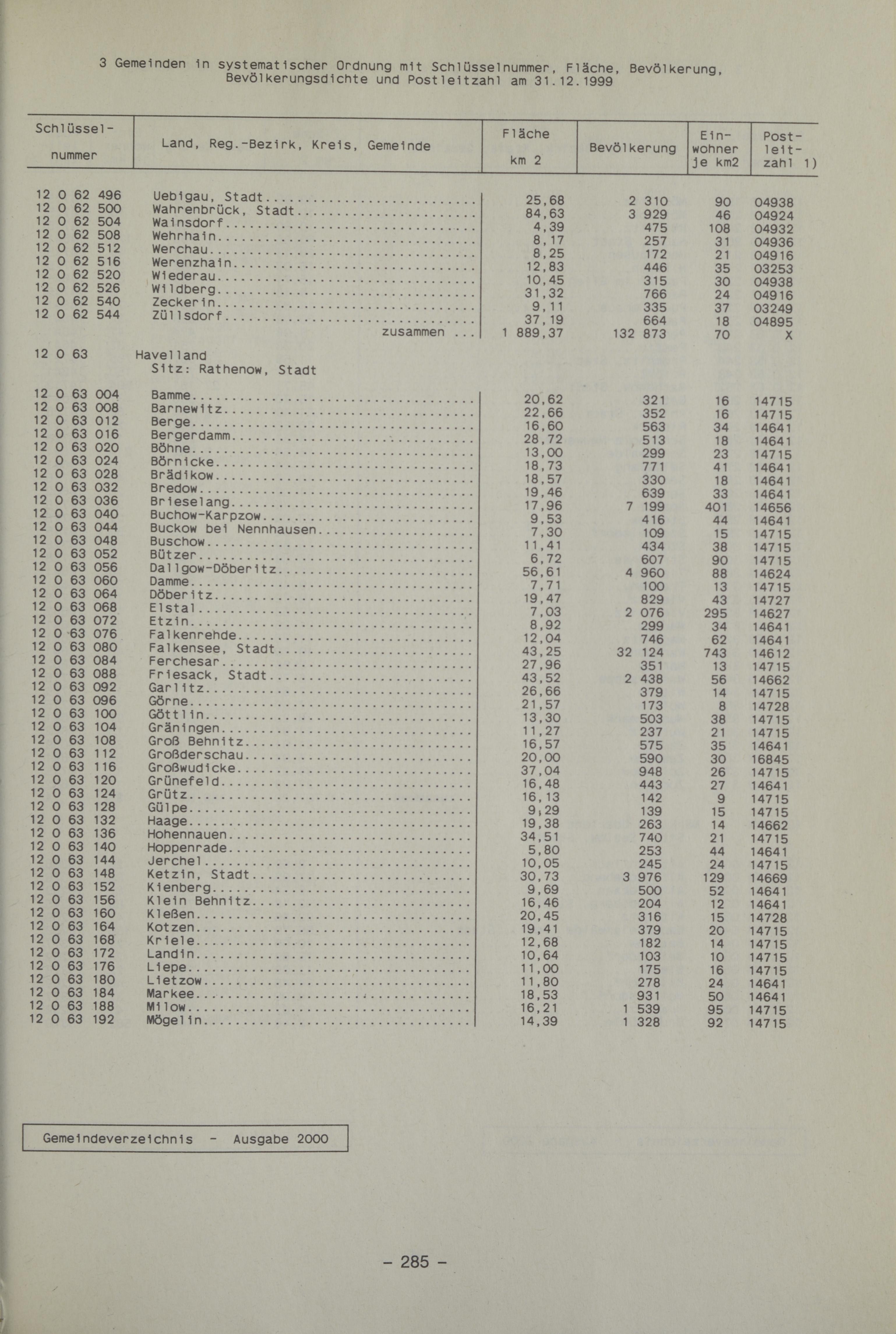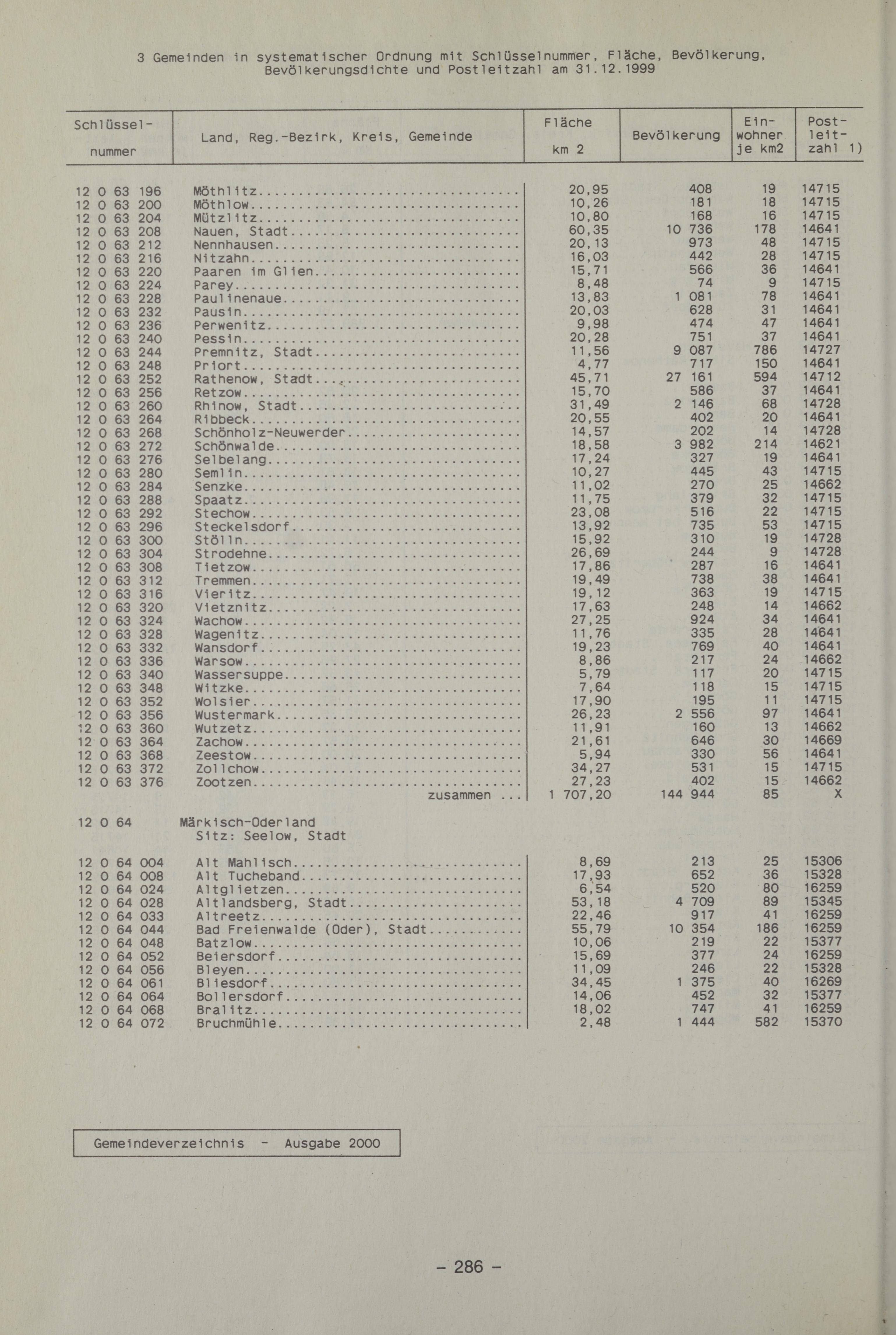 - 3 Gemeinden in systematischer Ordnung mit Schlüsselnummer, Fläche, Bevölkerung, Bevölkerungsdichte und Postleitzahl am 31.12.1999