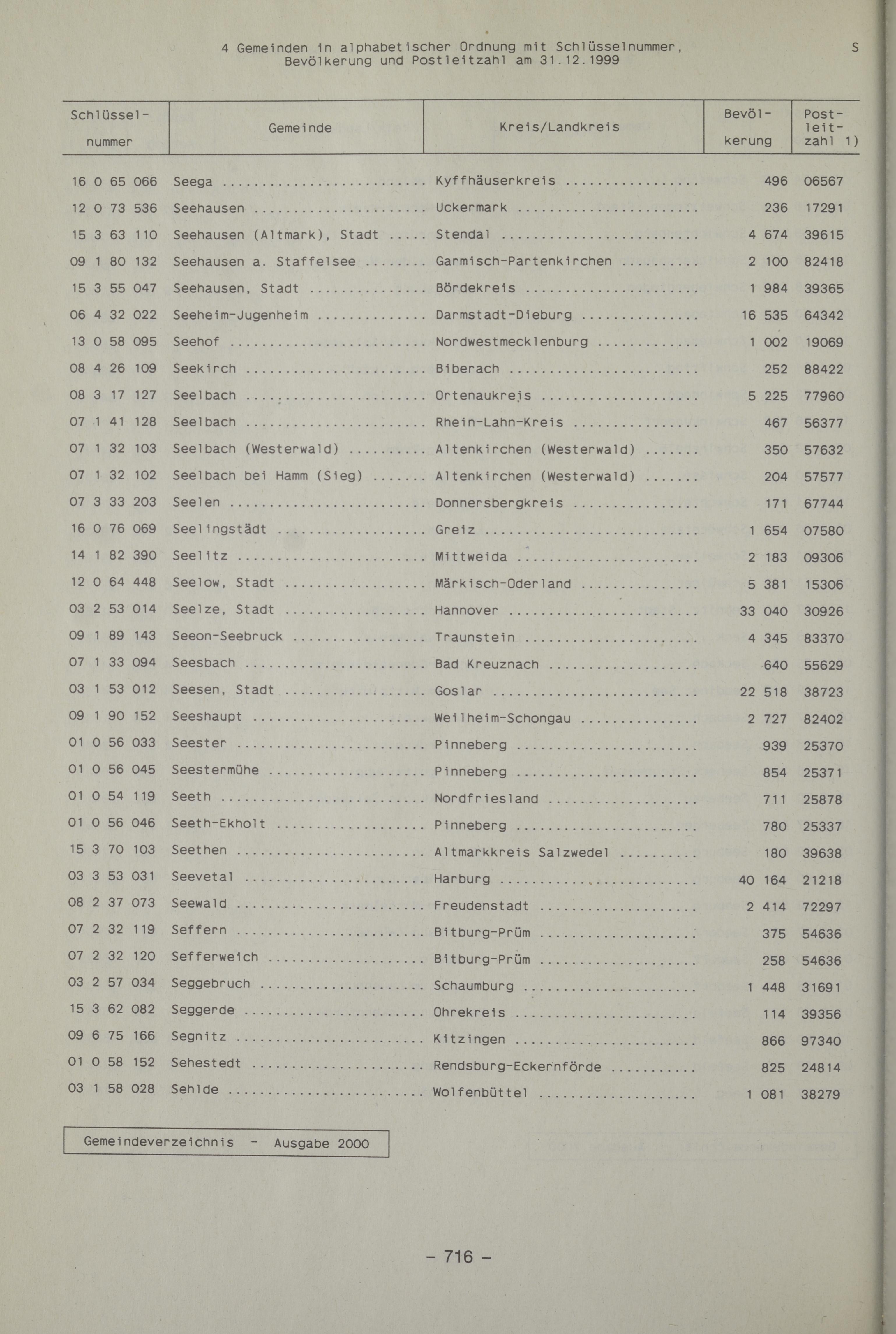 - 4 Gemeinden in alphabetischer Ordnung mit Schlüsselnummer, Bevölkerung und Postleitzahl am 31.12.1999
