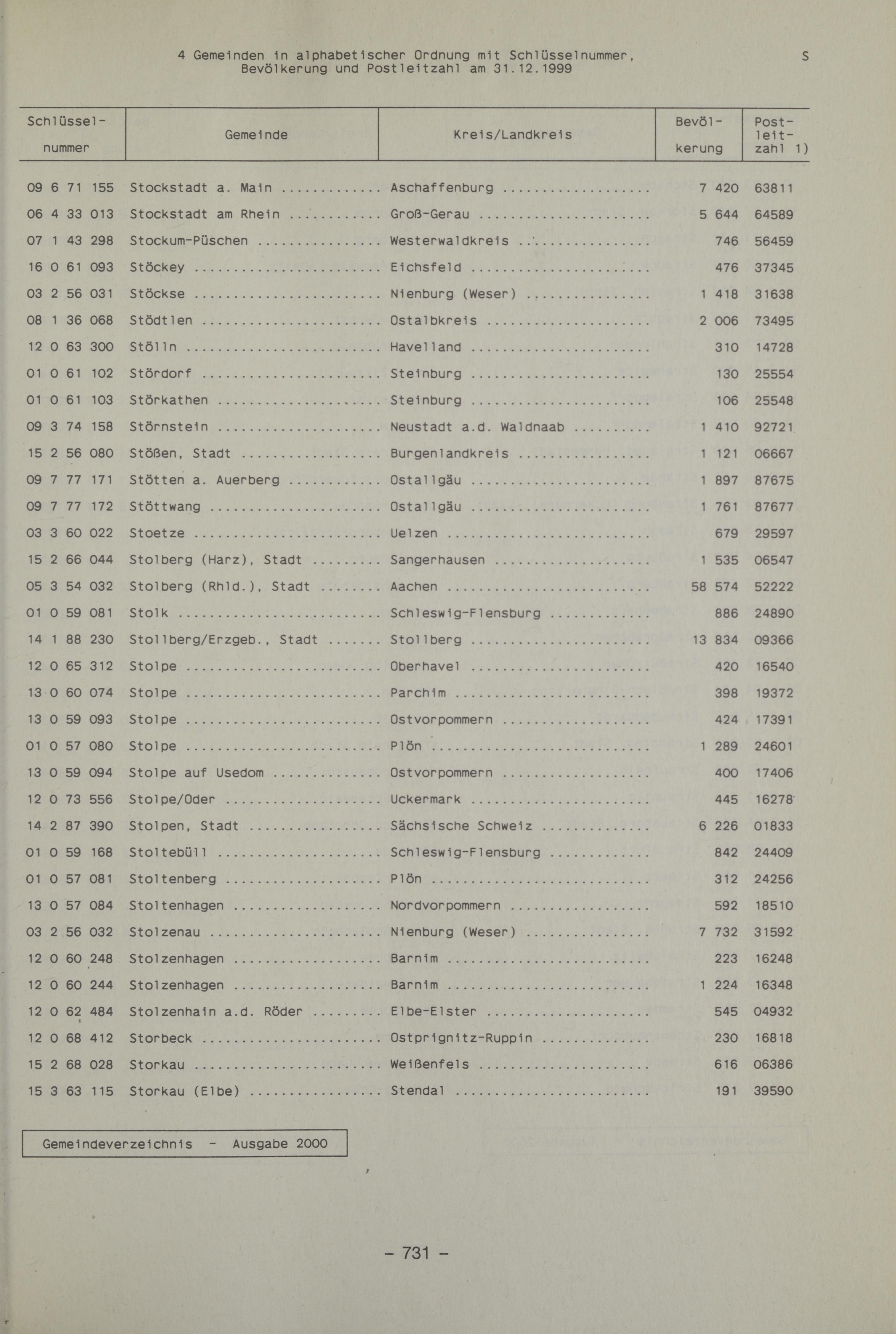 - 4 Gemeinden in alphabetischer Ordnung mit Schlüsselnummer, Bevölkerung und Postleitzahl am 31.12.1999