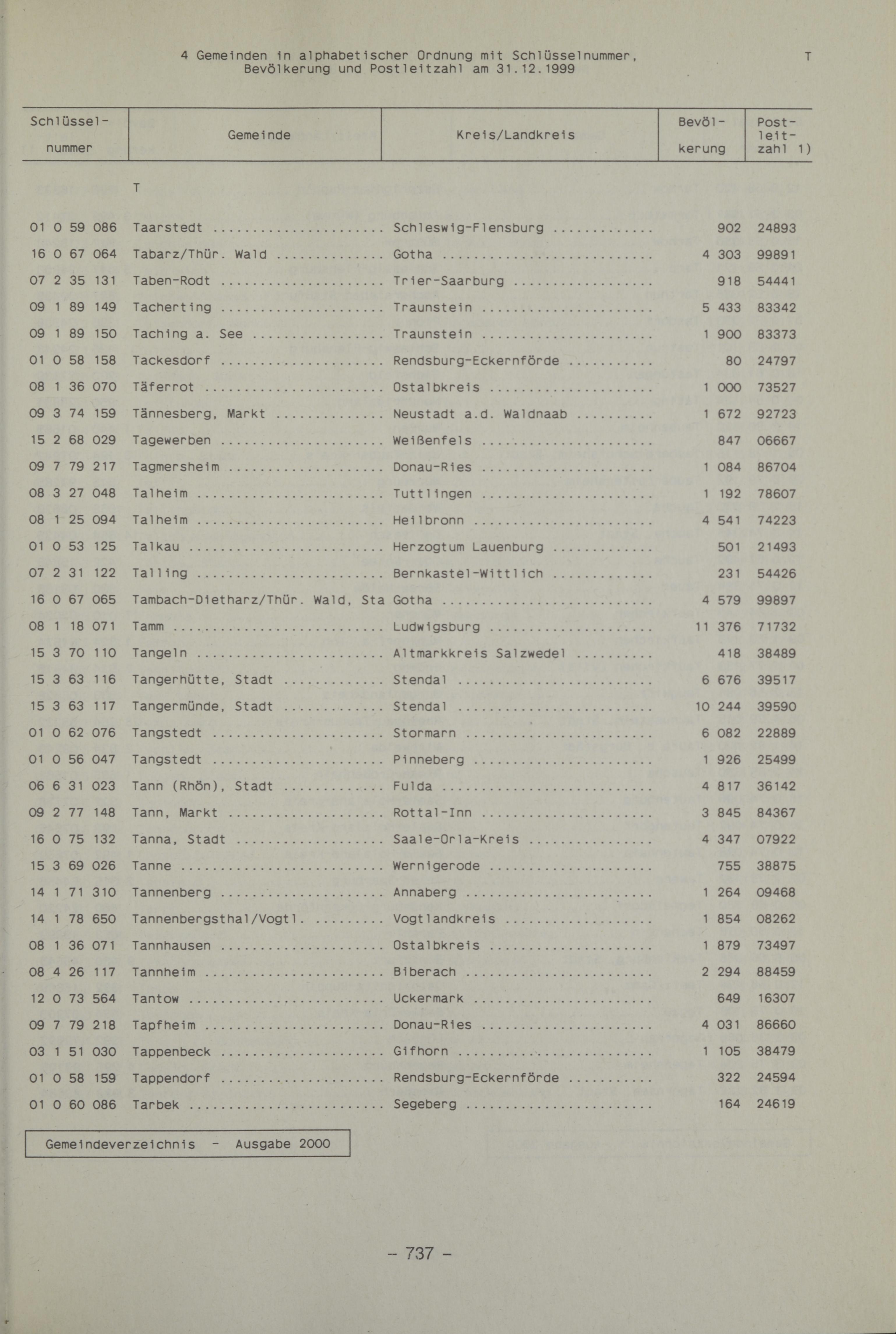 2000InhaltZeichenerklärung / AbkürzungenVorbemerkungEinführungEntwicklung der Zahl der kreisfreien Städte, Landkreise und GemeindenSchematische Übersicht über Aufbau und Inhalt der GemeindeschlüsselnummernVerwaltungsgliederung des Bundesgebietes am 31.12.1999Bevölkerungsdichte in den Kreisen der Bundesrepublik Deutschlands am 31.12.1999Karten der Bundesrepublik Deutschlands mit Ländern-, Regierungsbezirks- und Kreisgrenzen nach dem 31.12.19991 Kreisfreie Städte und Landkreise am 31.12.19991.1 Fläche, Bevölkerung und Bevölkerungsdichte in den kreisfreien Städten und Landkreisen1.2 Regierungsbezirke, kreisfreie Städte und Landkreise in alphabetischer Ordnung2 Gemeinden, Fläche und Bevölkerung in den Gemeindeverbänden am 31.12.19993 Gemeinden in systematischer Ordnung mit Schlüsselnummer, Fläche, Bevölkerung, Bevölkerungsdichte und Postleitzahl am 31.12.199901 Schleswig-Holstein und 02 Hamburg03 Niedersachsen und 04 Bremen05 Nordrhein-Westfalen06 Hessen07 Rheinland-Pfalz08 Baden-Württemberg09 Bayern10 Saarland11 Berlin und 12 Brandenburg13 Mecklenburg-Vorpommern14 Sachsen15 Sachsen-Anhalt16 Thüringen4 Gemeinden in alphabetischer Ordnung mit Schlüsselnummer, Bevölkerung und Postleitzahl am 31.12.19995 Gemeinden mit 5000 Einwohnern und mehr nach Einwohnergrößenklassen mit ihrer Postleitzahl, Fläche, Bevölkerung und Bevölkerungsdichte am 31.12.19996 Kreisfreie Städte, Landkreise und Gemeinden nach Größenklassen6.1 Gemeinden von 1950 bis 1999 nach Einwohnergrößenklassen6.2 Kreisfreie Städte und Landkreise in den Ländern am 31.12.19996.3 Gemeinden in den Ländern am 31.12.1999 nach Einwohnerklassen6.4 Gemeinden in den Ländern am 31.12.1999 nach Flächengrößenklassen6.5 Gemeinden in den Ländern am 31.12.1999 nach der Bevölkerungsdichte7 Die kleinste und größten Gemeinden und Kreise nach der Fläche, Bevölkerung und Bevölkerungsdichte am 31.12.19997.1 Die 10 kleinsten Gemeinden7.2 Die 10 größten Gemeinden7.3 Die 20 kleinsten Kreise7.4 Die 20 größten Kreise8 Städte am 31.12.19998.1 Fläche, Bevölkerung und Bevölkerungsdichte nach Einwohnergrößenklassen8.2 Nach Ländern und Einwohnergrößenklassen