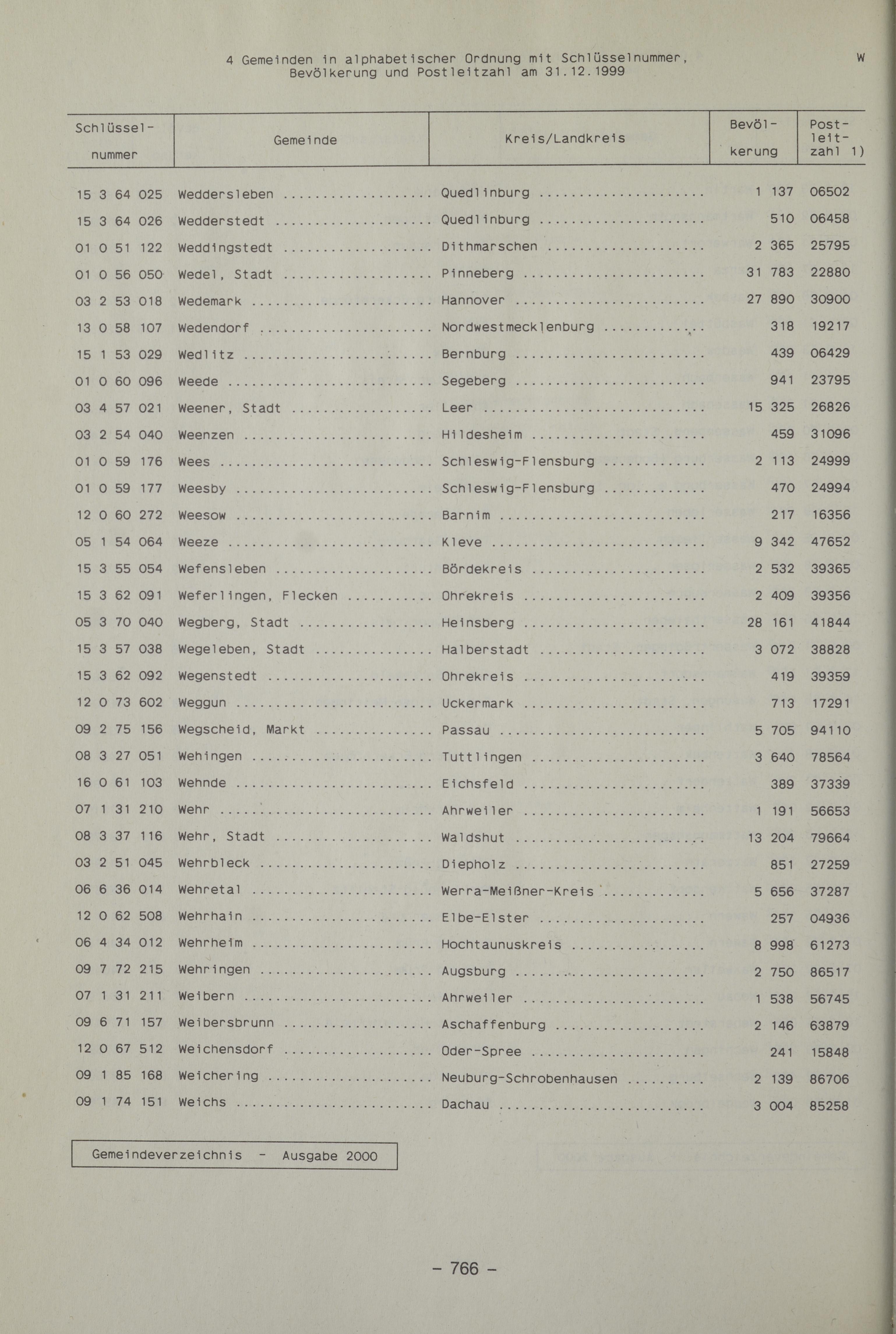 - 4 Gemeinden in alphabetischer Ordnung mit Schlüsselnummer, Bevölkerung und Postleitzahl am 31.12.1999