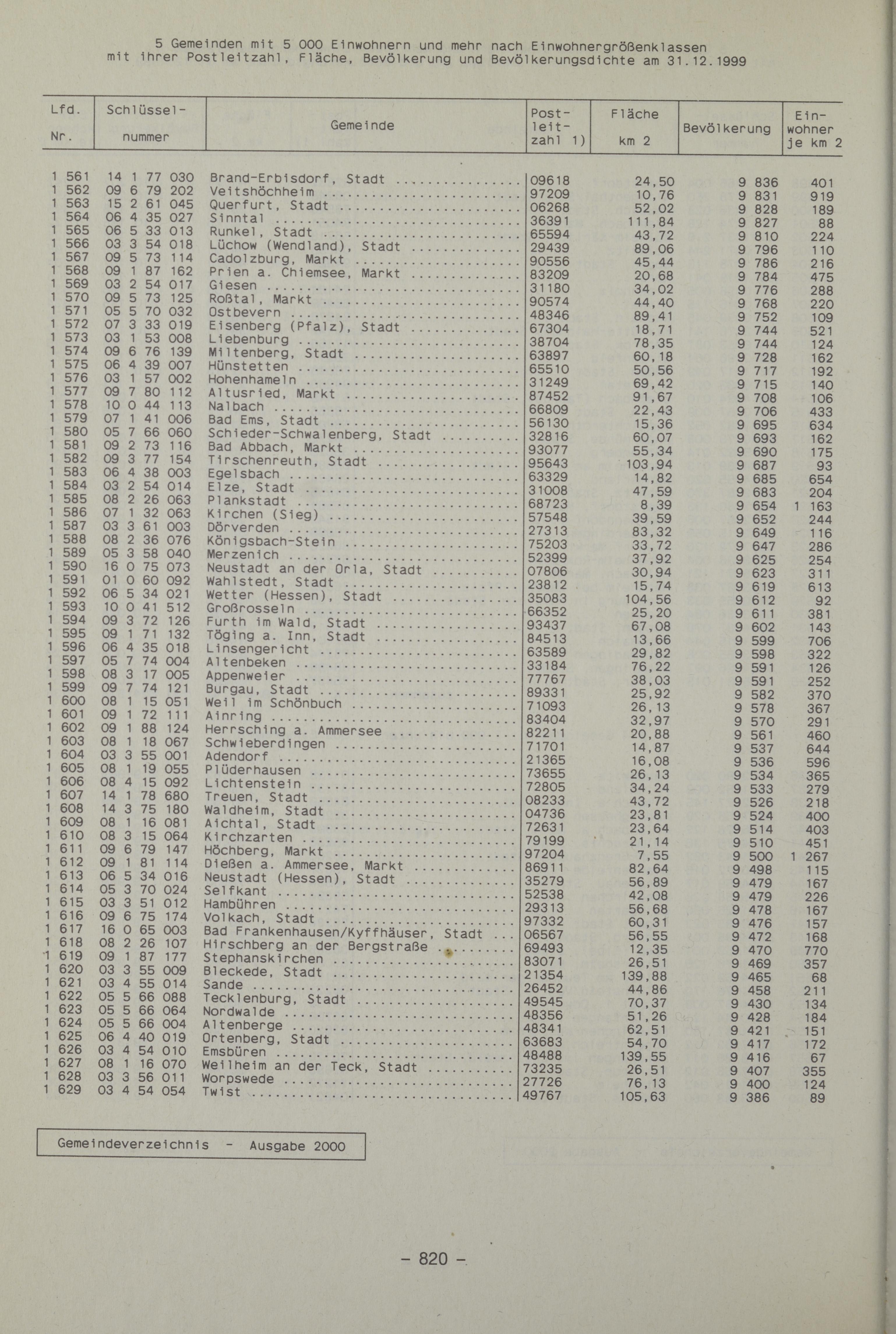 2000InhaltZeichenerklärung / AbkürzungenVorbemerkungEinführungEntwicklung der Zahl der kreisfreien Städte, Landkreise und GemeindenSchematische Übersicht über Aufbau und Inhalt der GemeindeschlüsselnummernVerwaltungsgliederung des Bundesgebietes am 31.12.1999Bevölkerungsdichte in den Kreisen der Bundesrepublik Deutschlands am 31.12.1999Karten der Bundesrepublik Deutschlands mit Ländern-, Regierungsbezirks- und Kreisgrenzen nach dem 31.12.19991 Kreisfreie Städte und Landkreise am 31.12.19991.1 Fläche, Bevölkerung und Bevölkerungsdichte in den kreisfreien Städten und Landkreisen1.2 Regierungsbezirke, kreisfreie Städte und Landkreise in alphabetischer Ordnung2 Gemeinden, Fläche und Bevölkerung in den Gemeindeverbänden am 31.12.19993 Gemeinden in systematischer Ordnung mit Schlüsselnummer, Fläche, Bevölkerung, Bevölkerungsdichte und Postleitzahl am 31.12.199901 Schleswig-Holstein und 02 Hamburg03 Niedersachsen und 04 Bremen05 Nordrhein-Westfalen06 Hessen07 Rheinland-Pfalz08 Baden-Württemberg09 Bayern10 Saarland11 Berlin und 12 Brandenburg13 Mecklenburg-Vorpommern14 Sachsen15 Sachsen-Anhalt16 Thüringen4 Gemeinden in alphabetischer Ordnung mit Schlüsselnummer, Bevölkerung und Postleitzahl am 31.12.19995 Gemeinden mit 5000 Einwohnern und mehr nach Einwohnergrößenklassen mit ihrer Postleitzahl, Fläche, Bevölkerung und Bevölkerungsdichte am 31.12.19996 Kreisfreie Städte, Landkreise und Gemeinden nach Größenklassen6.1 Gemeinden von 1950 bis 1999 nach Einwohnergrößenklassen6.2 Kreisfreie Städte und Landkreise in den Ländern am 31.12.19996.3 Gemeinden in den Ländern am 31.12.1999 nach Einwohnerklassen6.4 Gemeinden in den Ländern am 31.12.1999 nach Flächengrößenklassen6.5 Gemeinden in den Ländern am 31.12.1999 nach der Bevölkerungsdichte7 Die kleinste und größten Gemeinden und Kreise nach der Fläche, Bevölkerung und Bevölkerungsdichte am 31.12.19997.1 Die 10 kleinsten Gemeinden7.2 Die 10 größten Gemeinden7.3 Die 20 kleinsten Kreise7.4 Die 20 größten Kreise8 Städte am 31.12.19998.1 Fläche, Bevölkerung und Bevölkerungsdichte nach Einwohnergrößenklassen8.2 Nach Ländern und Einwohnergrößenklassen