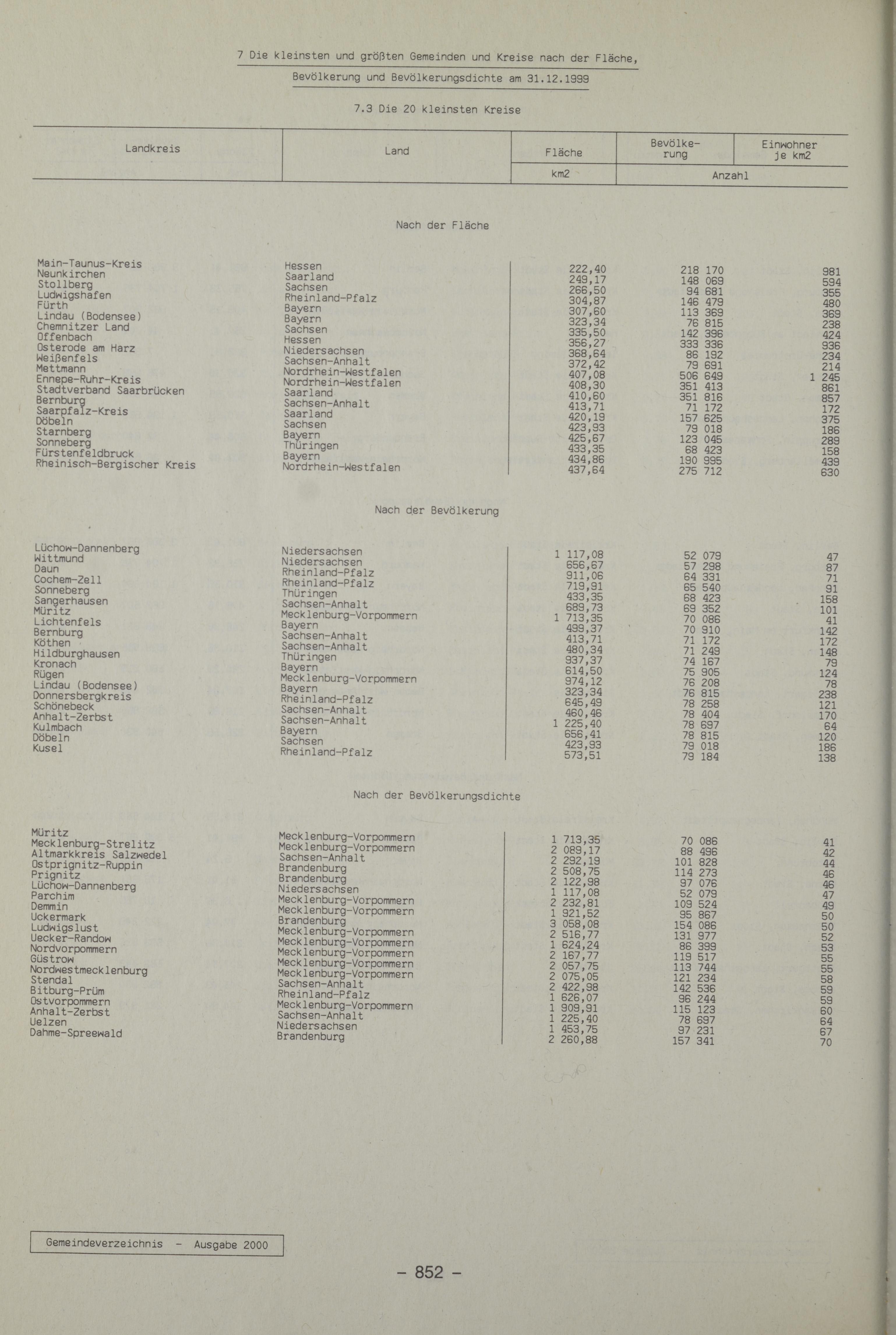 - 7 Die kleinste und größten Gemeinden und Kreise nach der Fläche, Bevölkerung und Bevölkerungsdichte am 31.12.1999