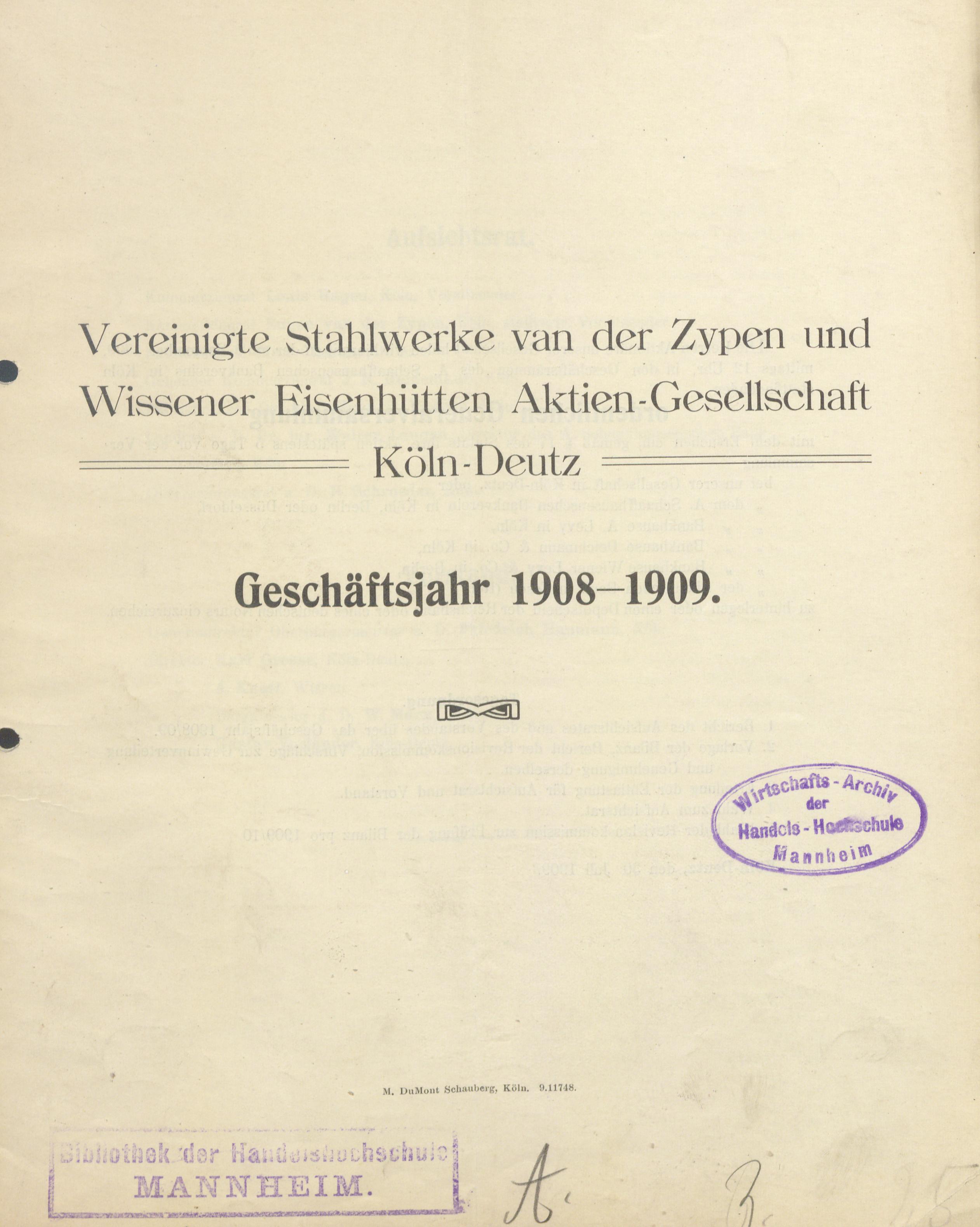 - Geschäftsjahr ... der Vereinigte Stahlwerke van der Zypen und Wissener Eisenhütten Aktien-Gesellschaft