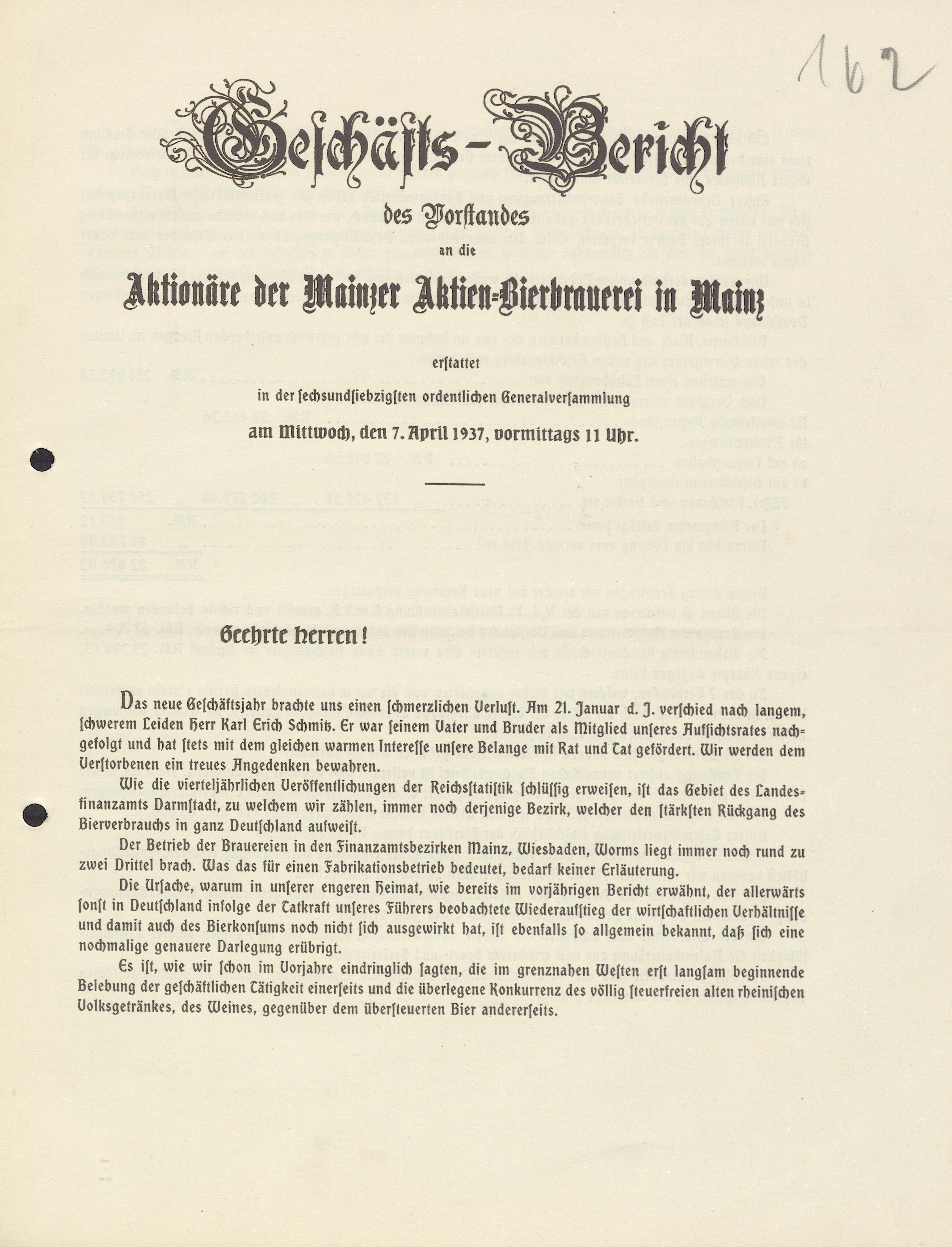 - Geschäfts-Bericht des Vorstandes an die Aktionäre der Mainzer Aktien-Bierbrauerei in Mainz