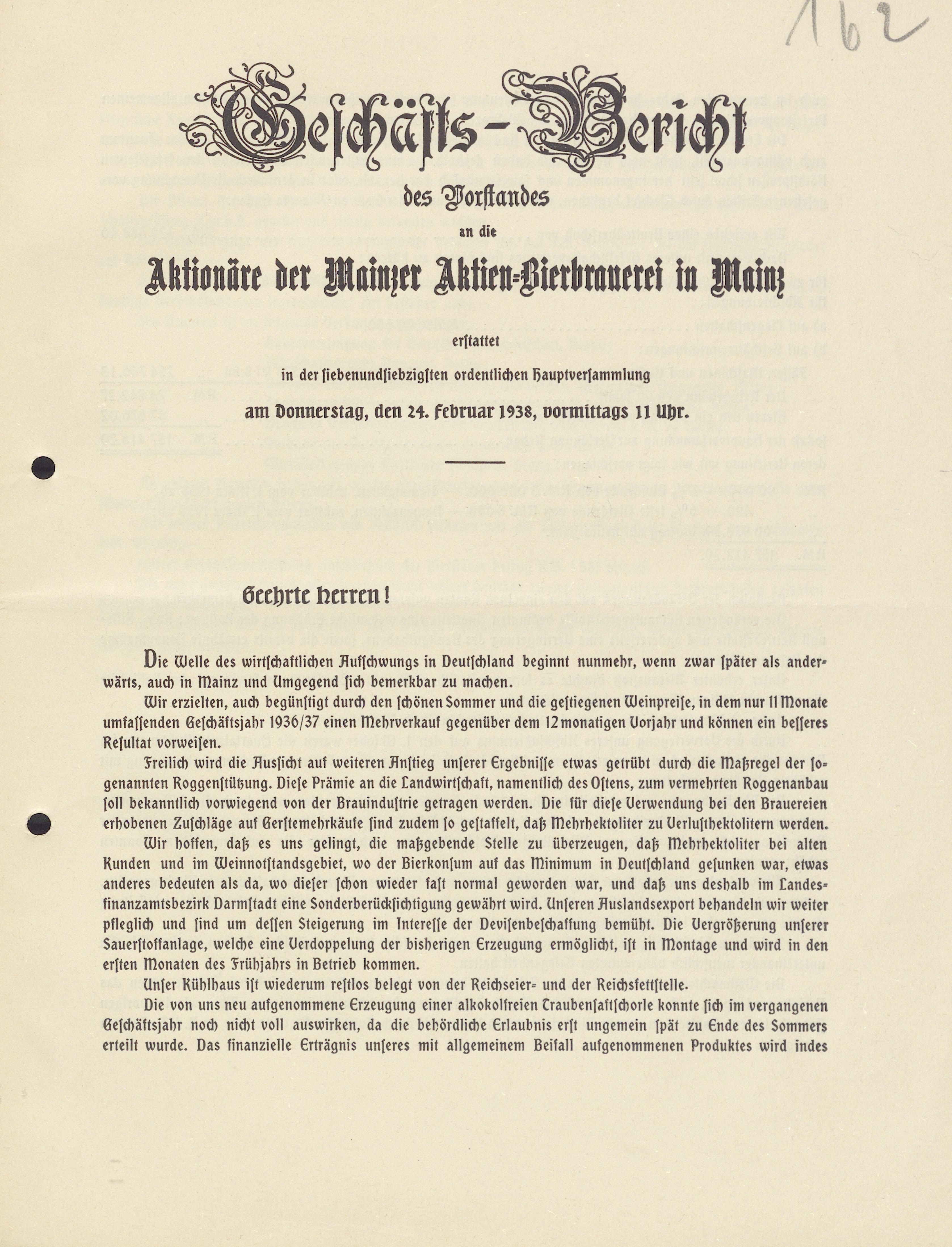 - Geschäfts-Bericht des Vorstandes an die Aktionäre der Mainzer Aktien-Bierbrauerei in Mainz