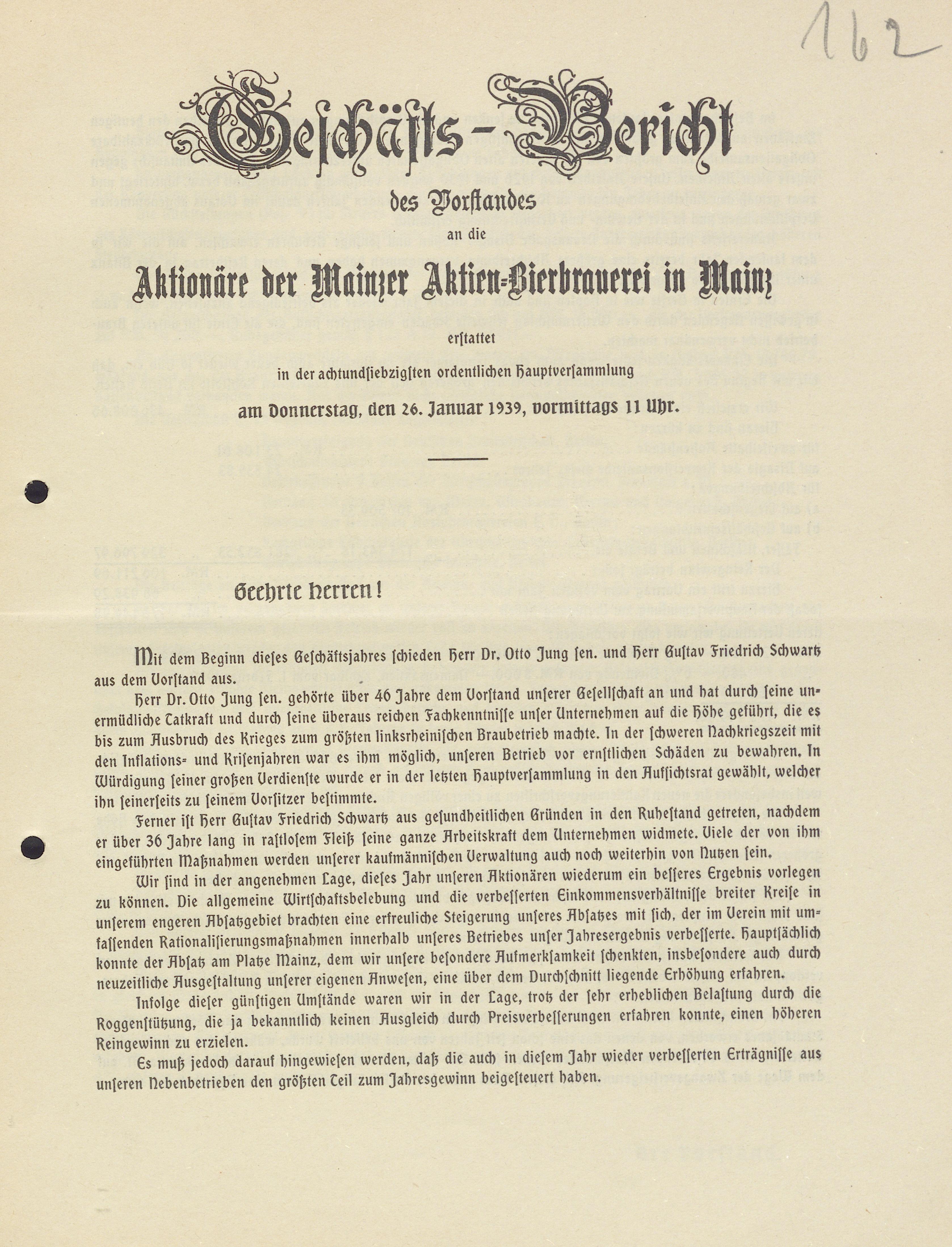 - Geschäfts-Bericht des Vorstandes an die Aktionäre der Mainzer Aktien-Bierbrauerei in Mainz