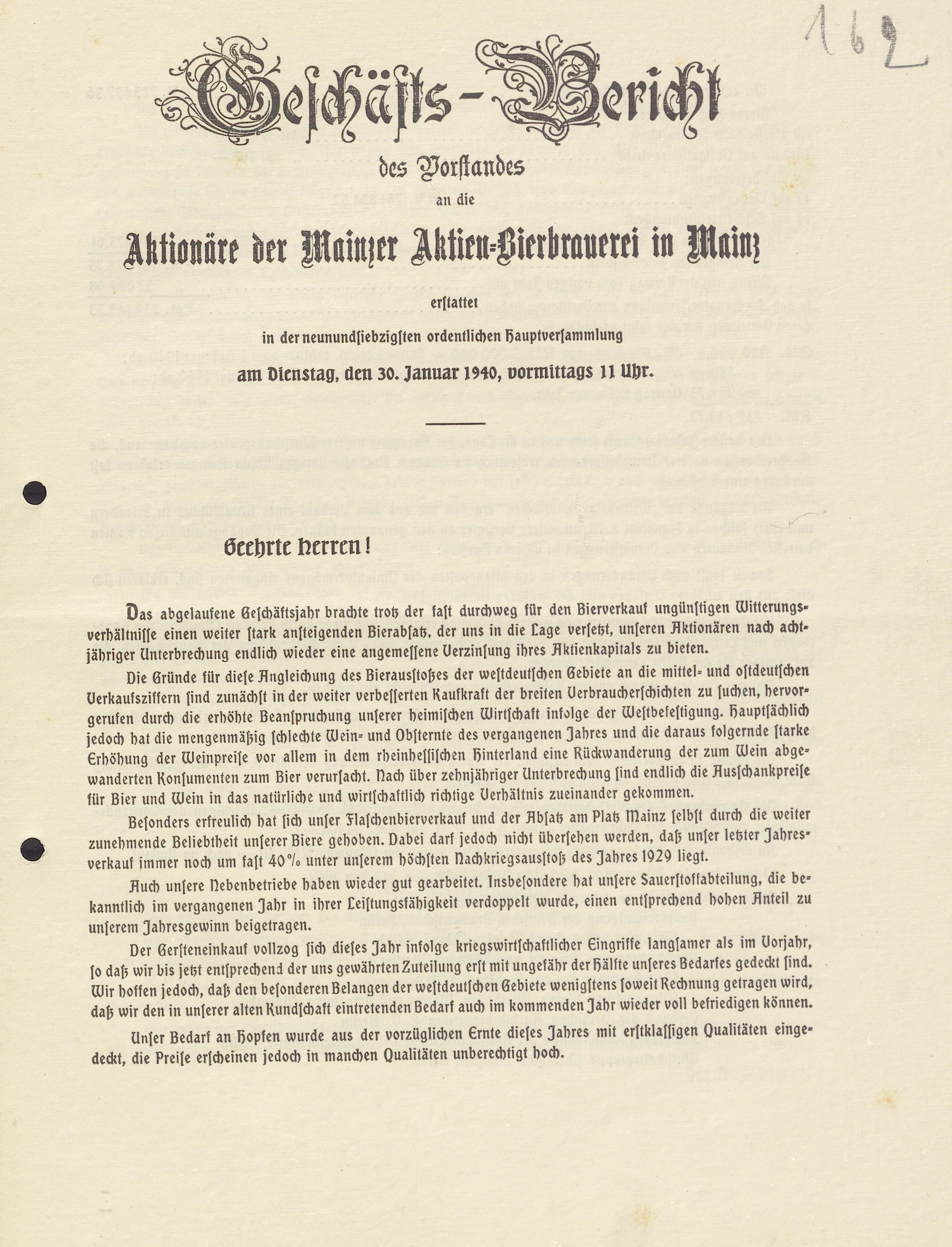 - Geschäfts-Bericht des Vorstandes an die Aktionäre der Mainzer Aktien-Bierbrauerei in Mainz