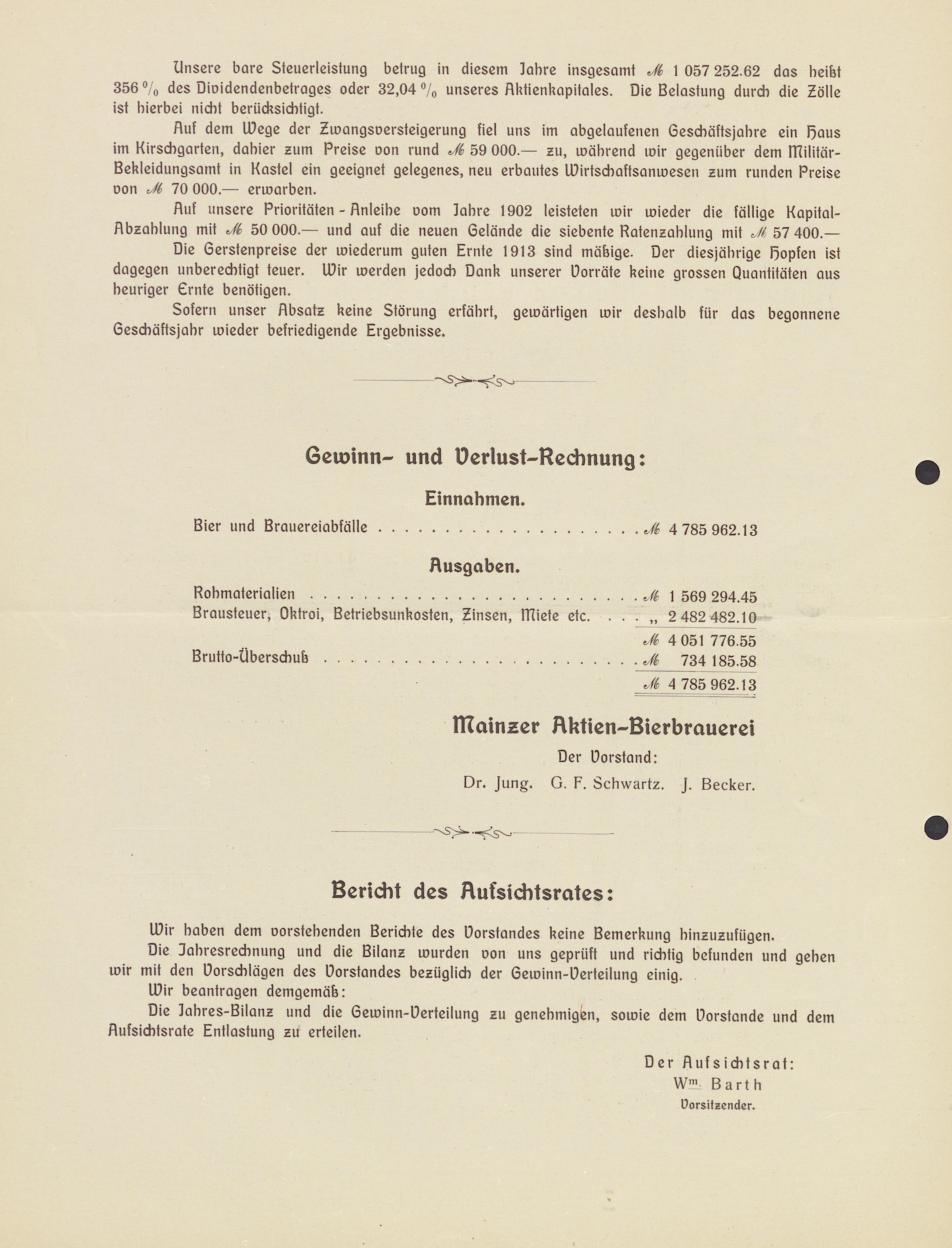 - Geschäfts-Bericht des Vorstandes an die Aktionäre der Mainzer Aktien-Bierbrauerei in Mainz