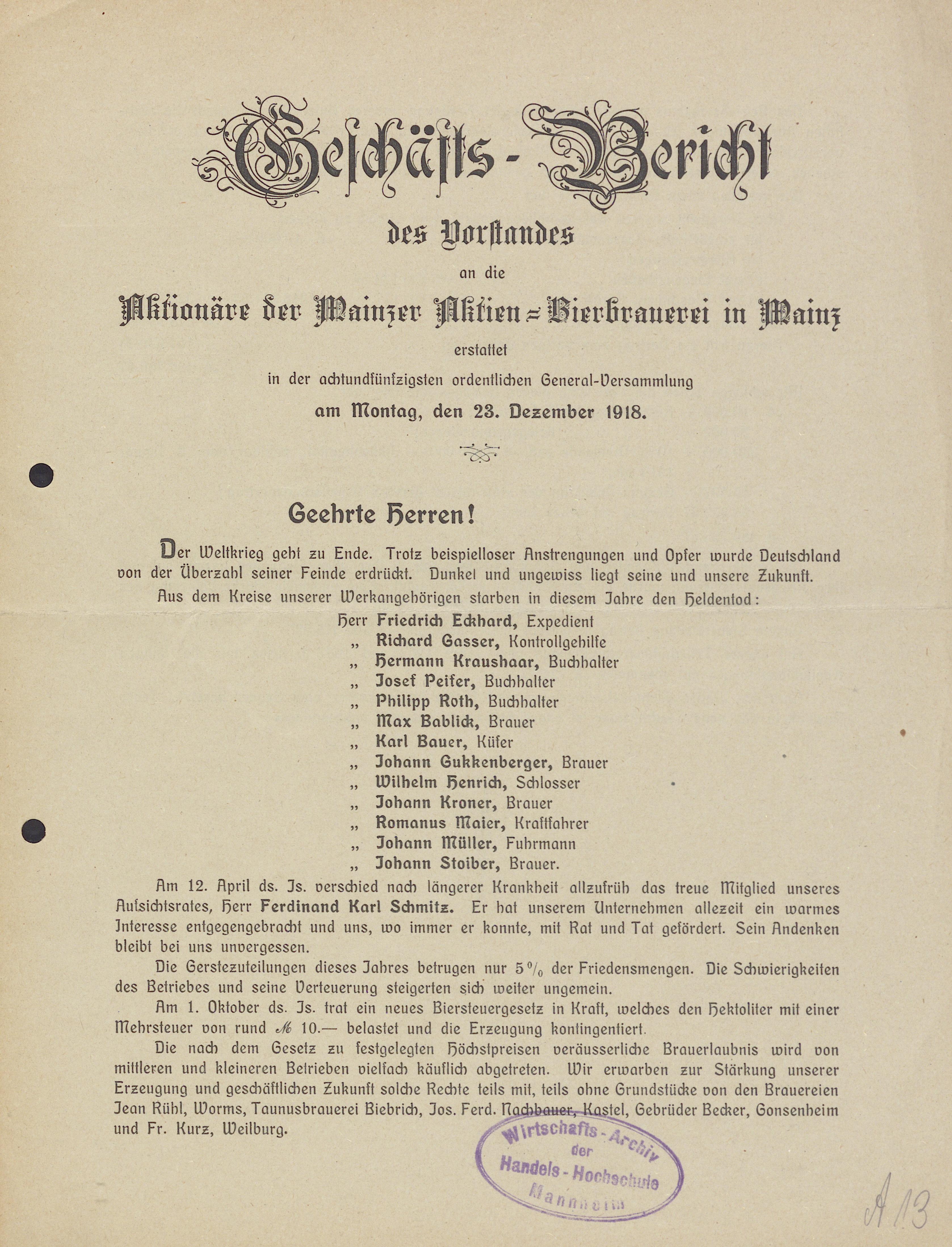 - Geschäfts-Bericht des Vorstandes an die Aktionäre der Mainzer Aktien-Bierbrauerei in Mainz