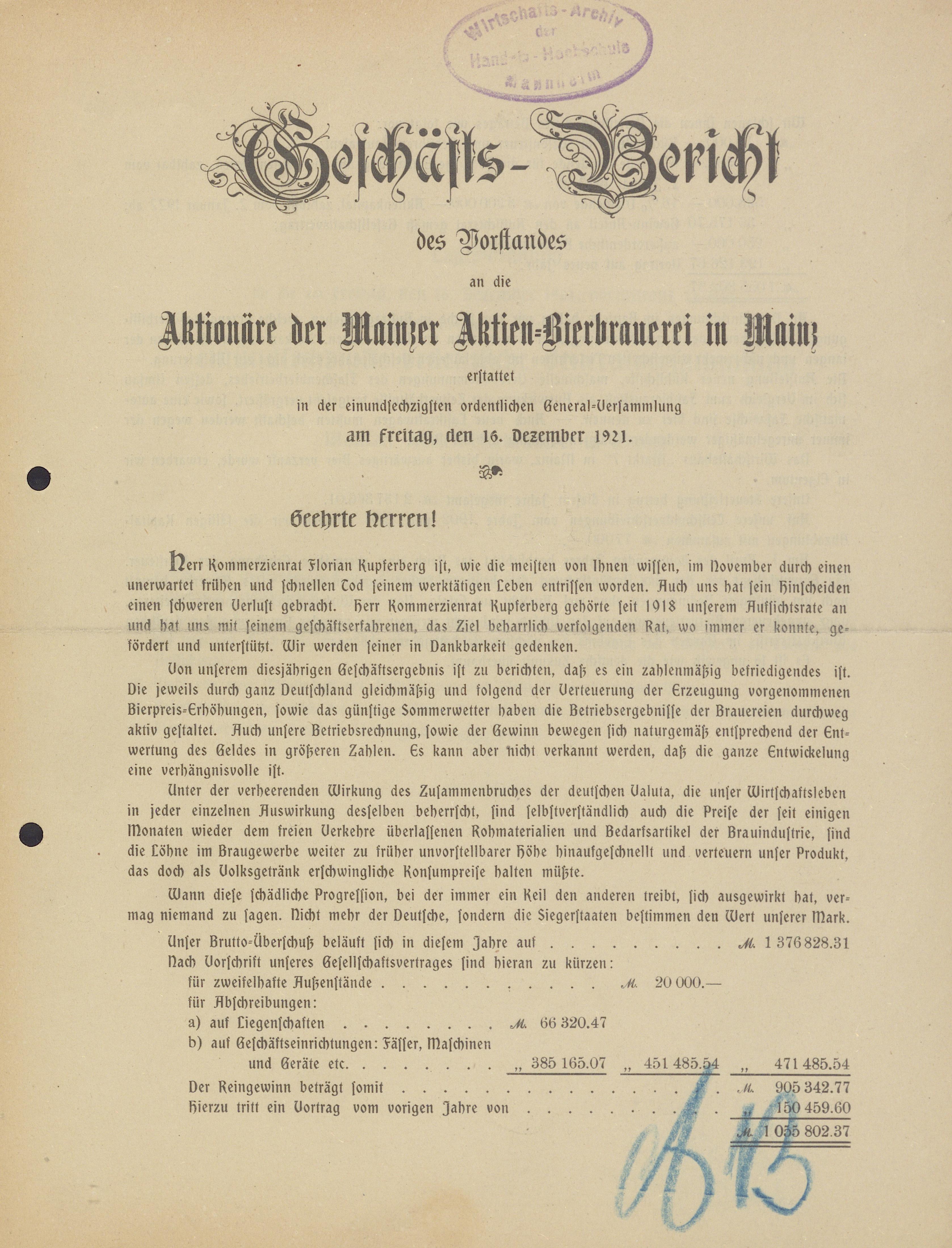 - Geschäfts-Bericht des Vorstandes an die Aktionäre der Mainzer Aktien-Bierbrauerei in Mainz