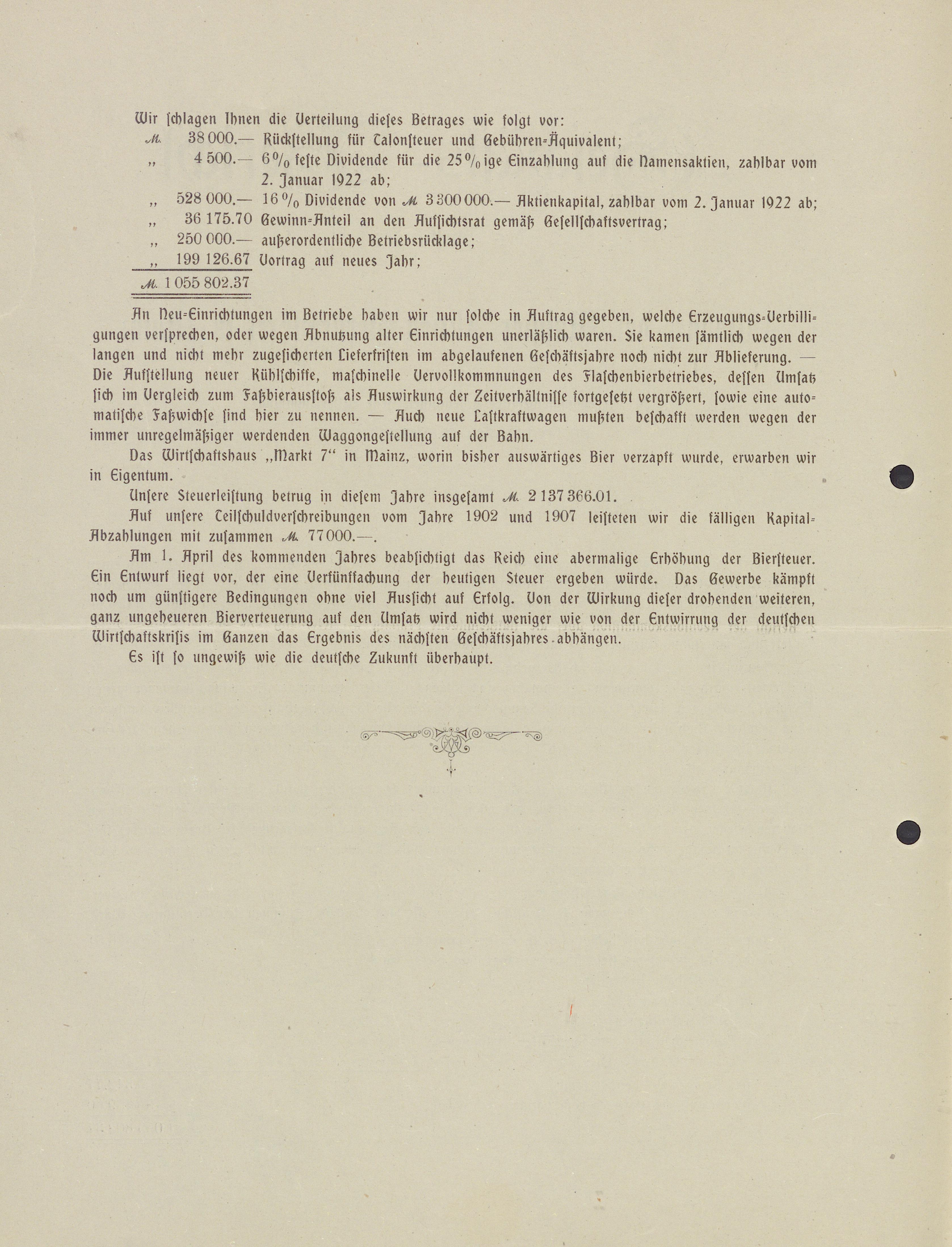 - Geschäfts-Bericht des Vorstandes an die Aktionäre der Mainzer Aktien-Bierbrauerei in Mainz