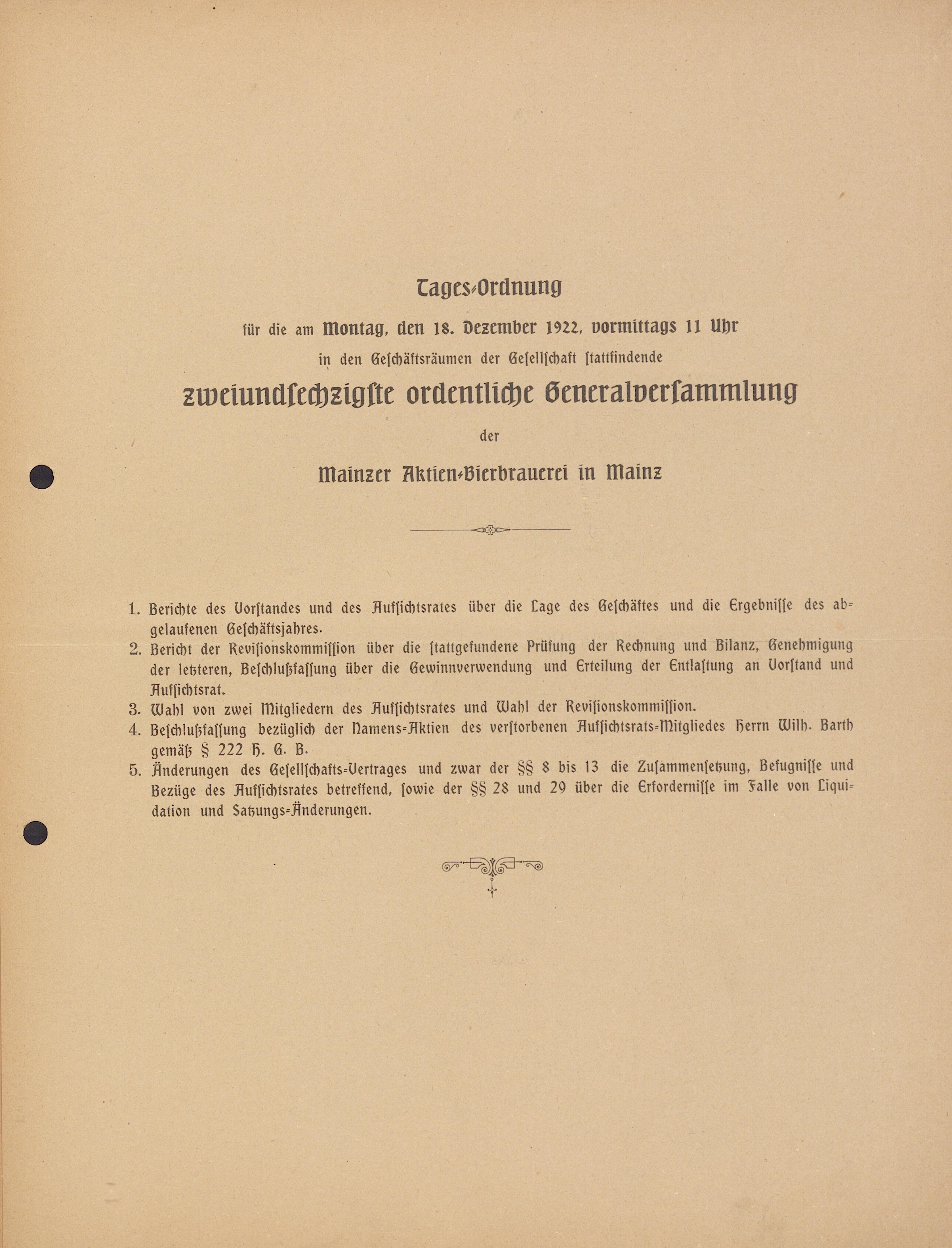 - Geschäfts-Bericht des Vorstandes an die Aktionäre der Mainzer Aktien-Bierbrauerei in Mainz