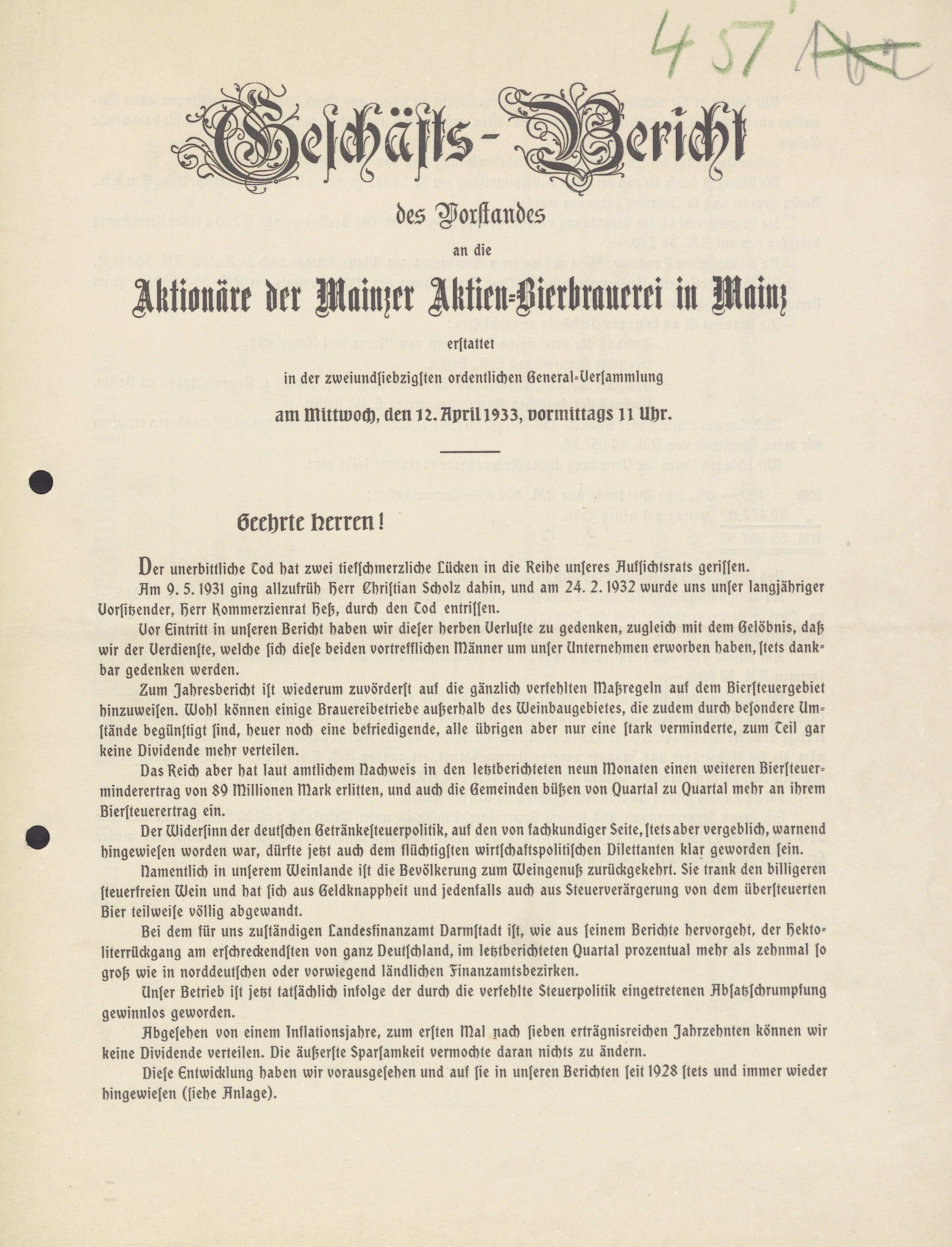 - Geschäfts-Bericht des Vorstandes an die Aktionäre der Mainzer Aktien-Bierbrauerei in Mainz