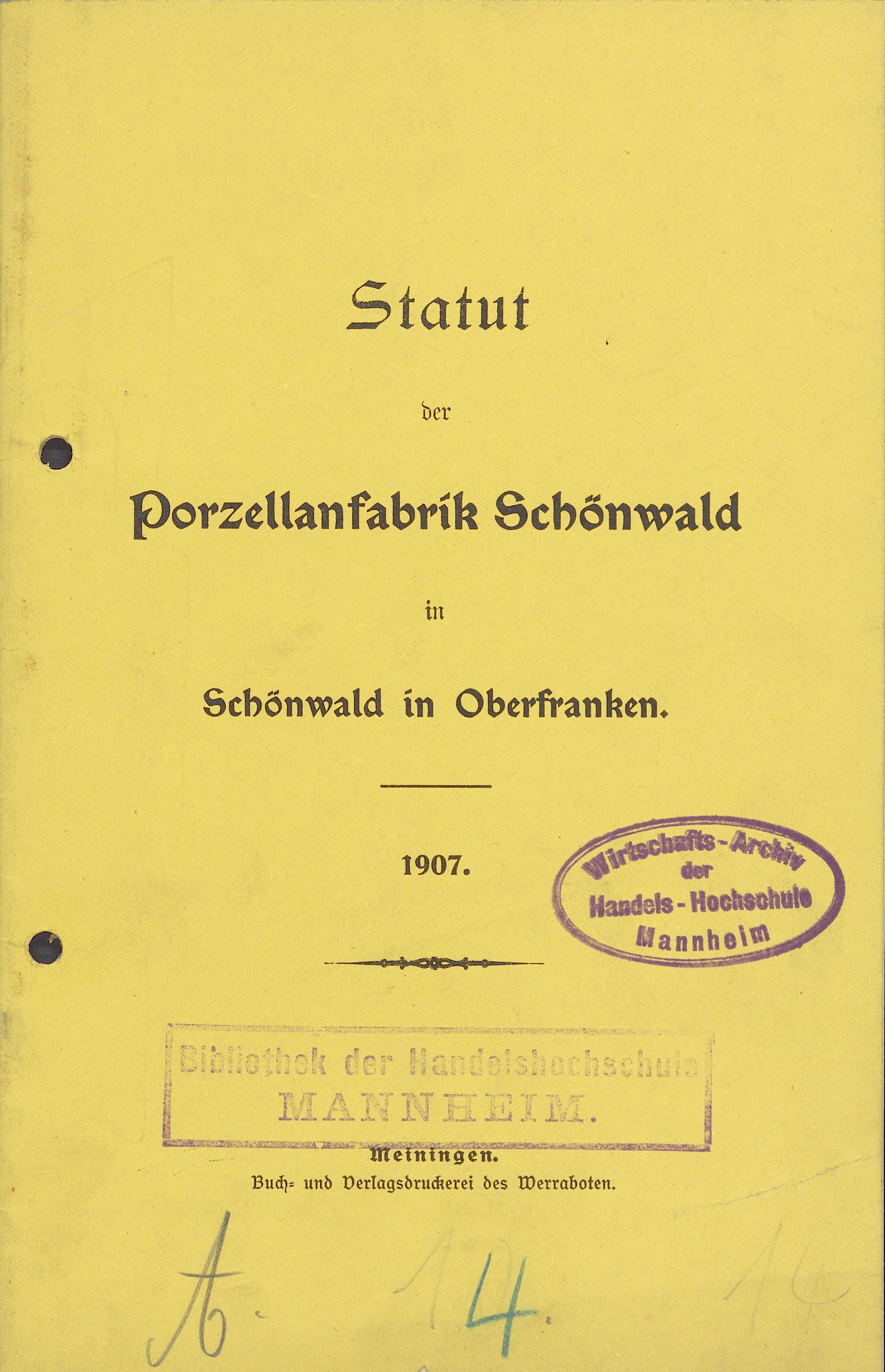 - [Anhang] Statut der Porzellanfabrik Schönwald ... 1907.