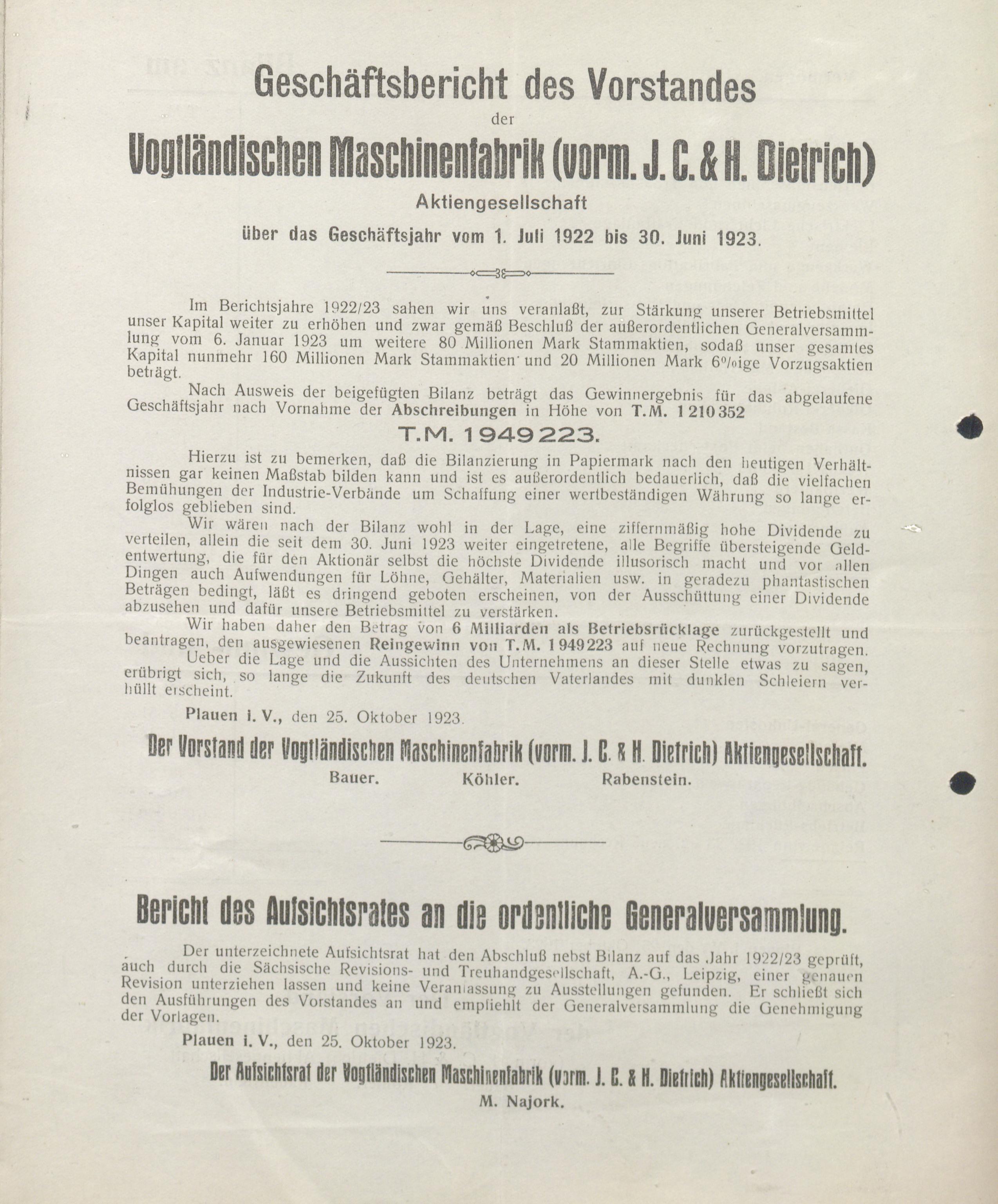 - Geschäfts-Bericht des Vorstandes der Vogtländischen Maschinenfabrik (Vormals J. C. & H. Dietrich) Aktiengesellschaft