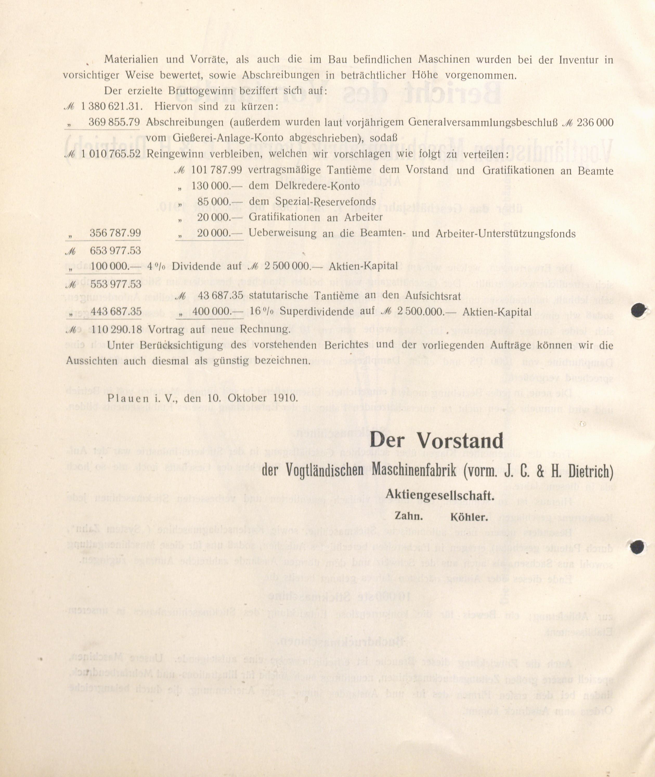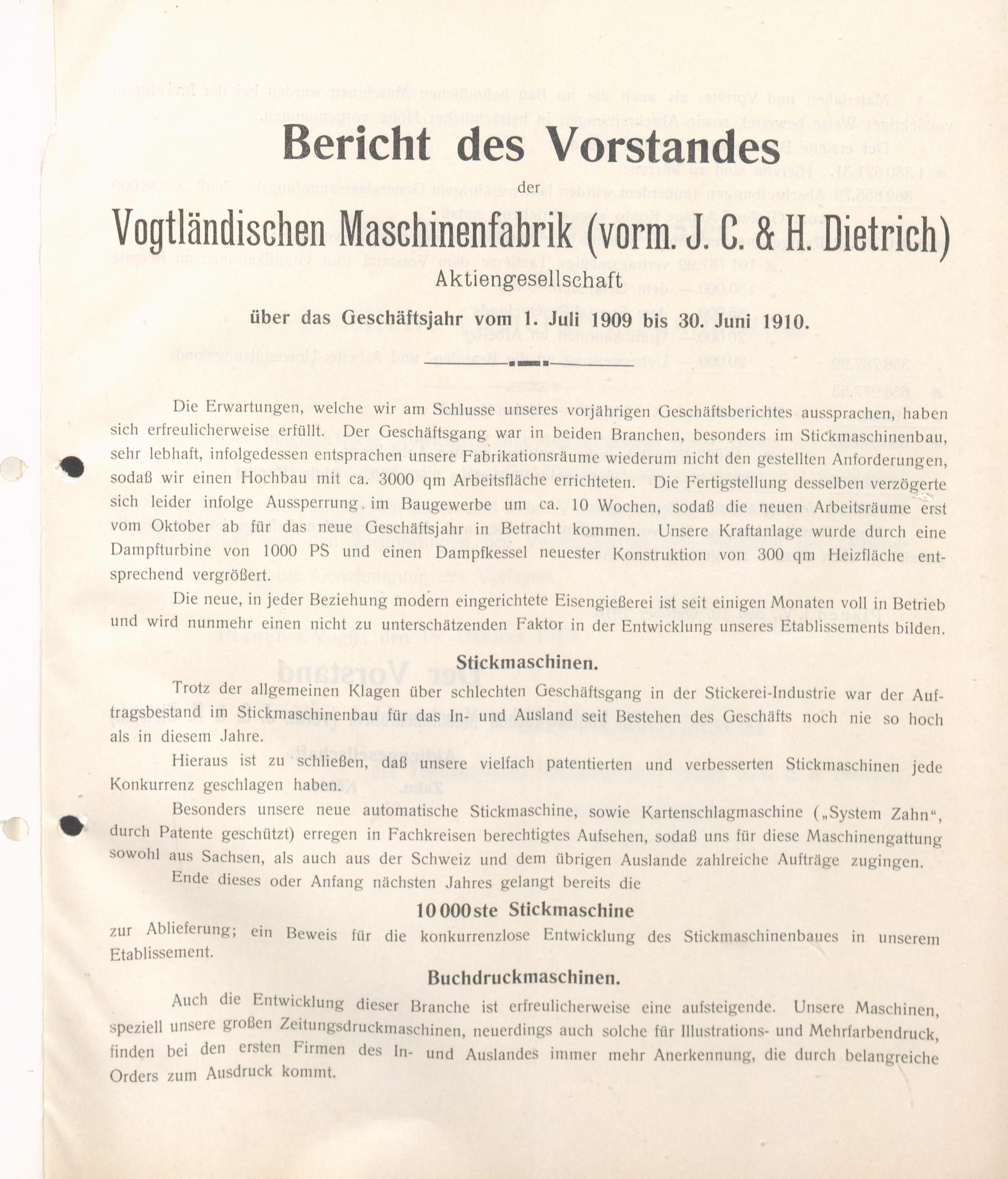 - Geschäfts-Bericht des Vorstandes der Vogtländischen Maschinenfabrik (Vormals J. C. & H. Dietrich) Aktiengesellschaft