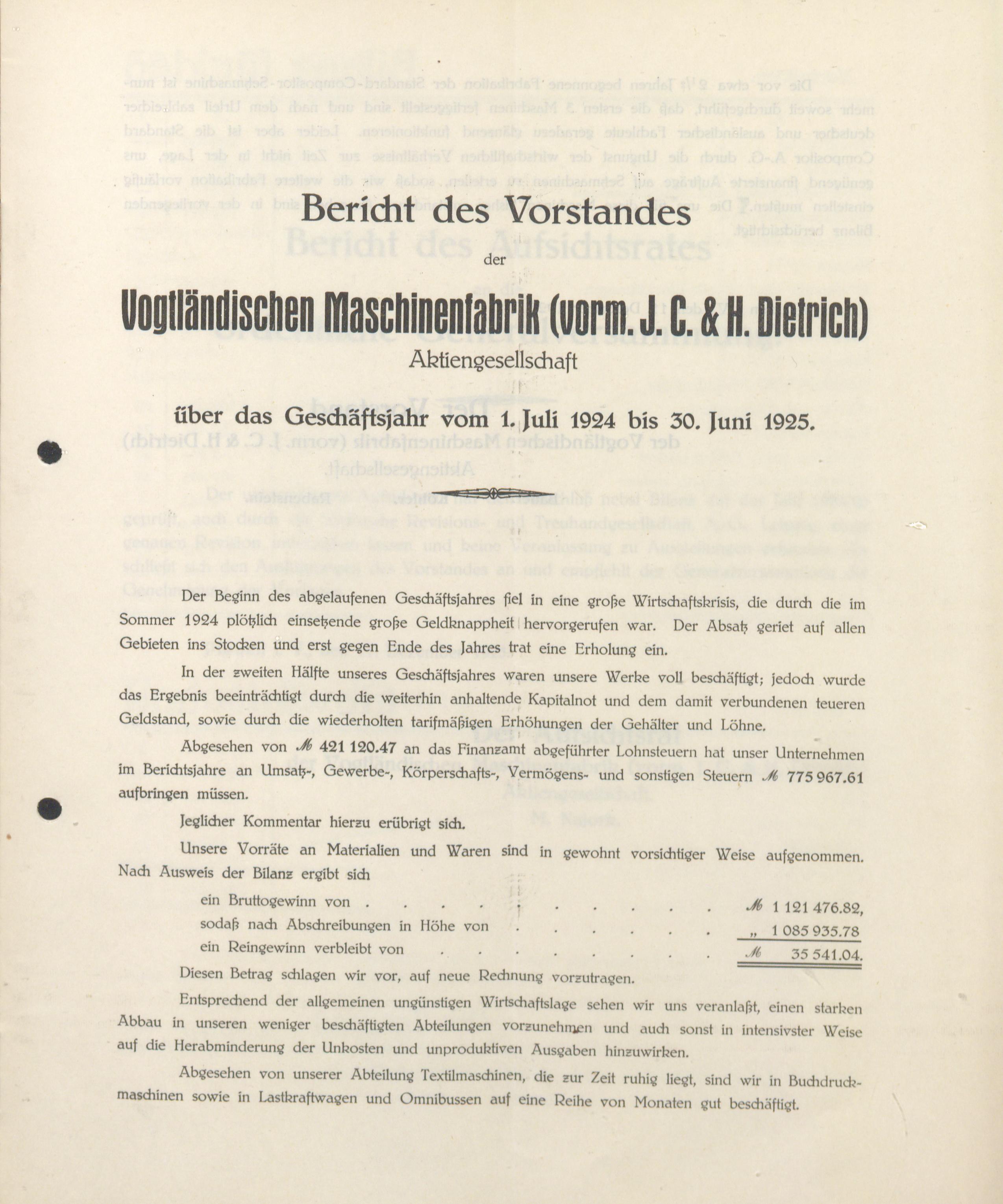 - Geschäfts-Bericht des Vorstandes der Vogtländischen Maschinenfabrik (Vormals J. C. & H. Dietrich) Aktiengesellschaft