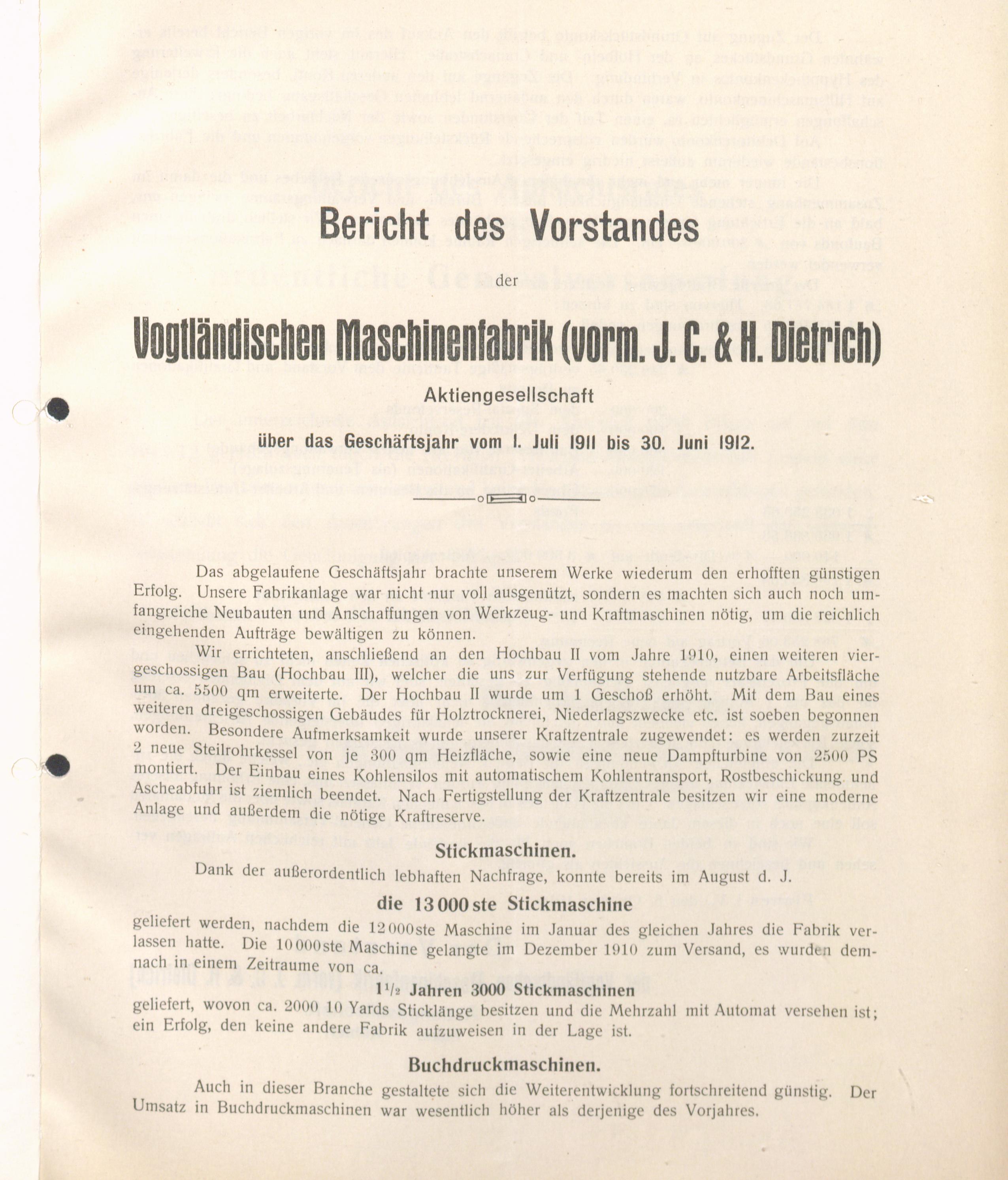 - Geschäfts-Bericht des Vorstandes der Vogtländischen Maschinenfabrik (Vormals J. C. & H. Dietrich) Aktiengesellschaft