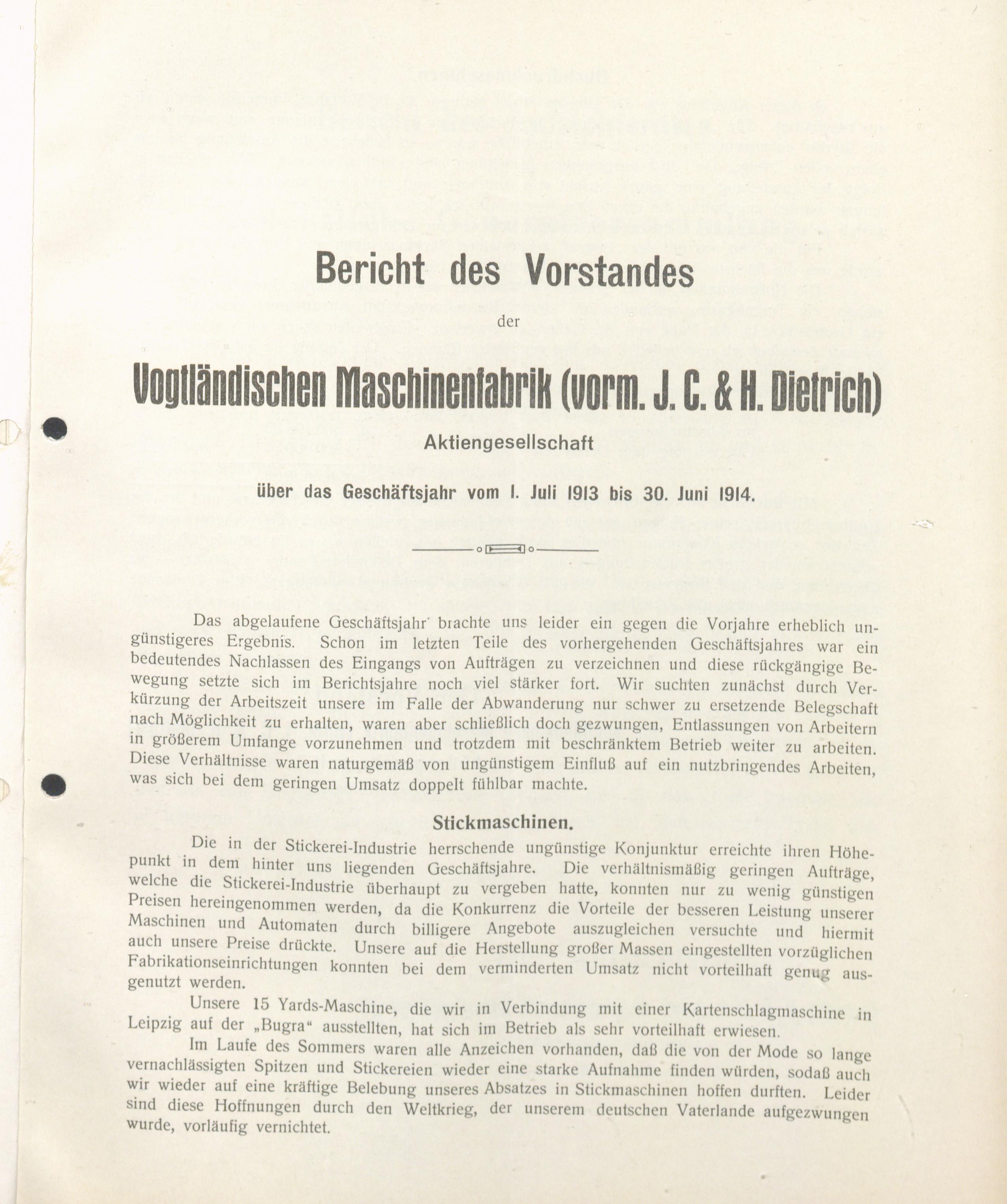 - Geschäfts-Bericht des Vorstandes der Vogtländischen Maschinenfabrik (Vormals J. C. & H. Dietrich) Aktiengesellschaft