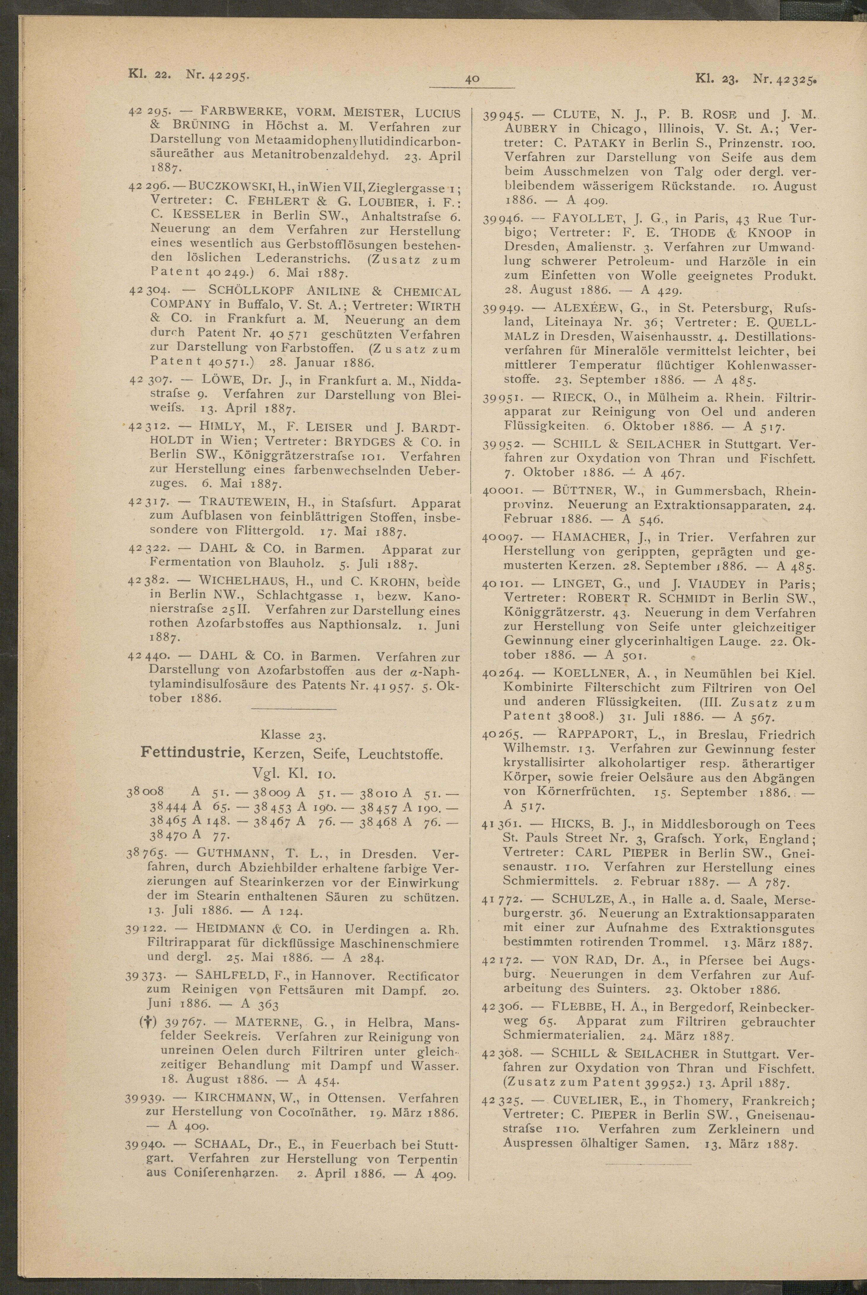 - II. Systematische Übersicht der vom 1. Januar bis zum 31. Dezember 1887 ertheilten Patente: P. R. 38570 - 42451.