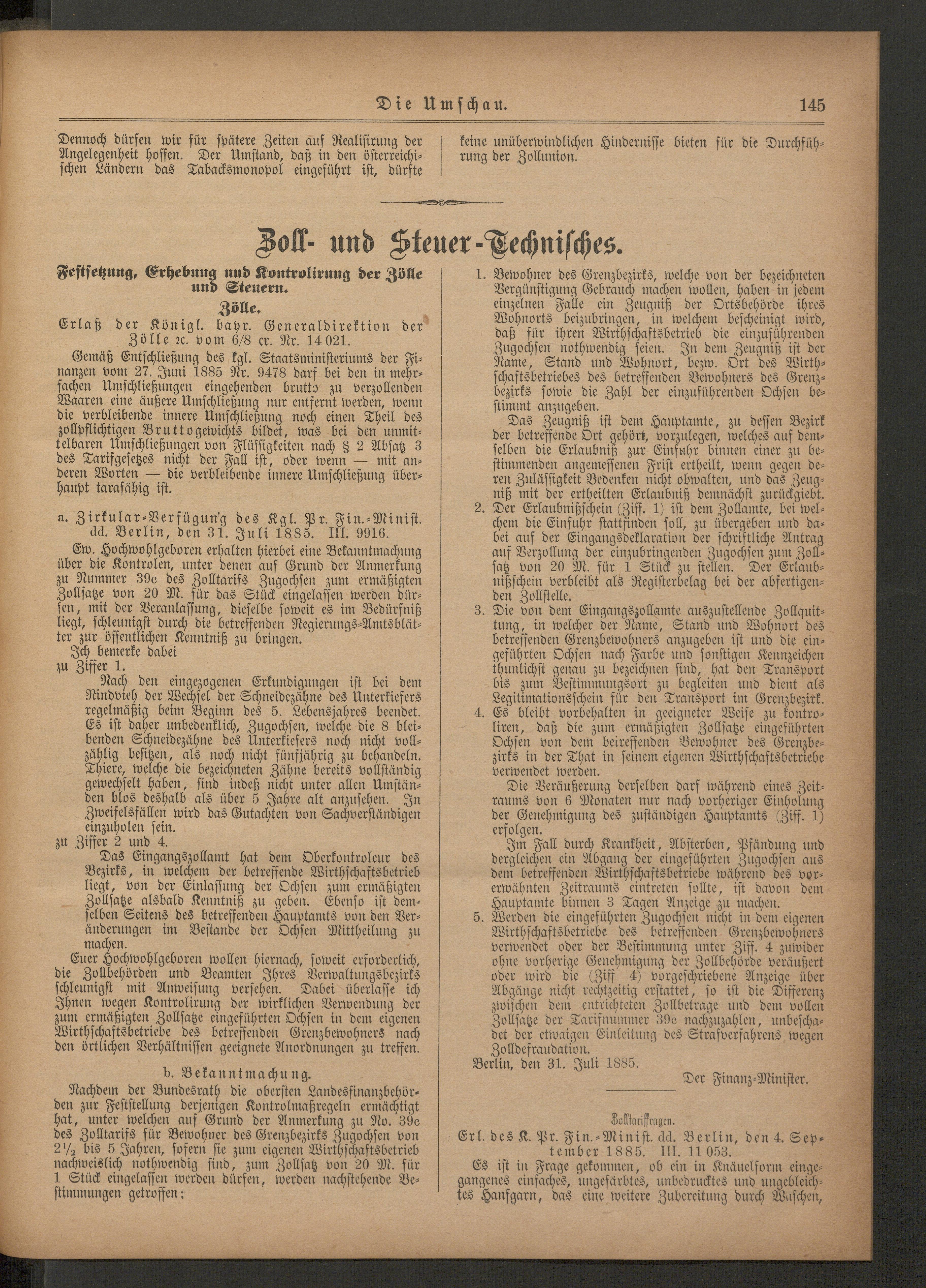Die Umschau auf dem Gebiete des Zoll- und Steuerwesens