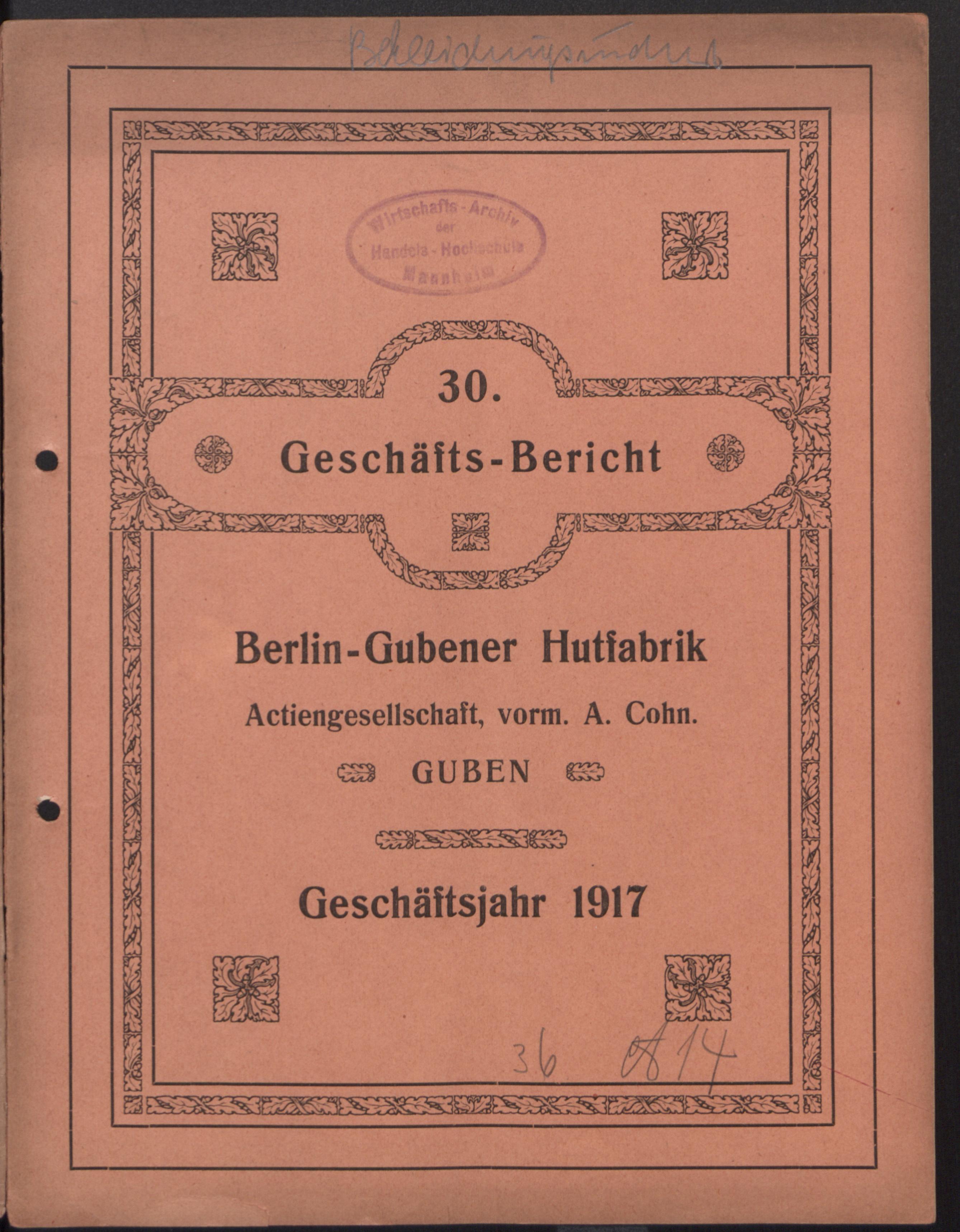 - Geschäftsbericht der Berlin-Gubener Hutfabrik-Aktiengesellschaft, Vormals A. Cohn