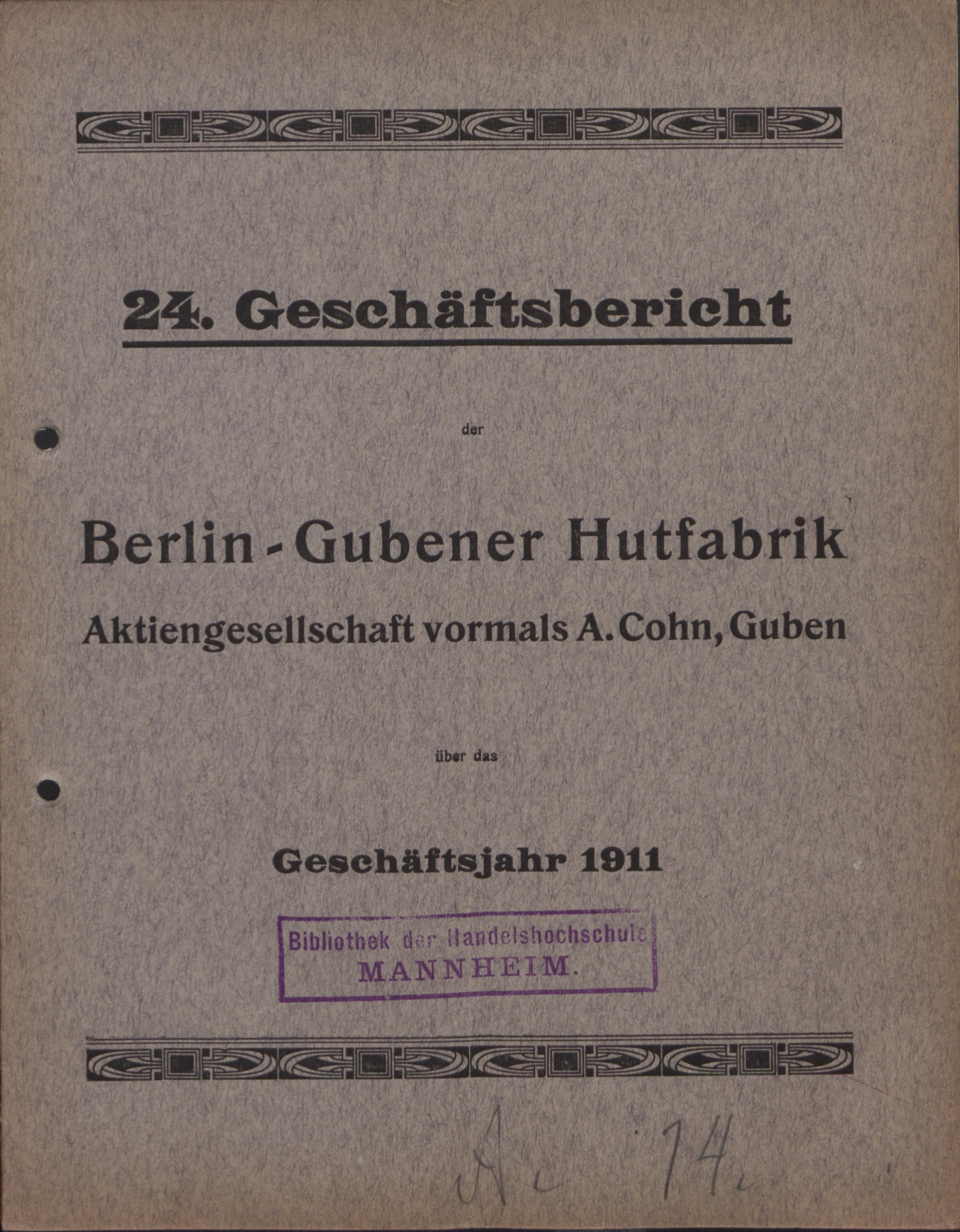 - Geschäftsbericht der Berlin-Gubener Hutfabrik-Aktiengesellschaft, Vormals A. Cohn